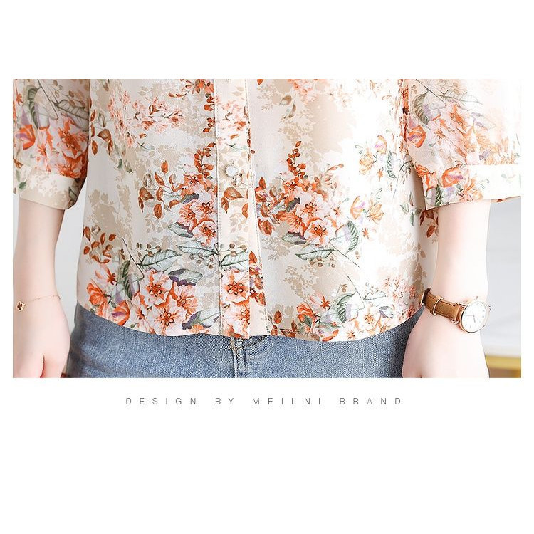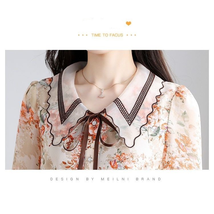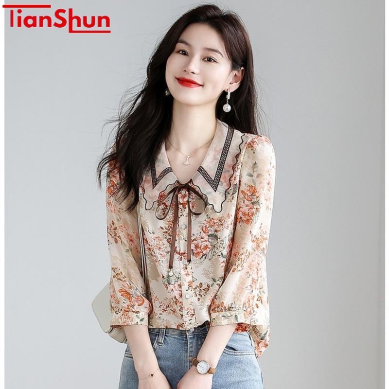 TianShun Floral Chiffon Shirt Korean Fashion 3/4 Sleeves Ruffled Doll Collar Top Casual Women