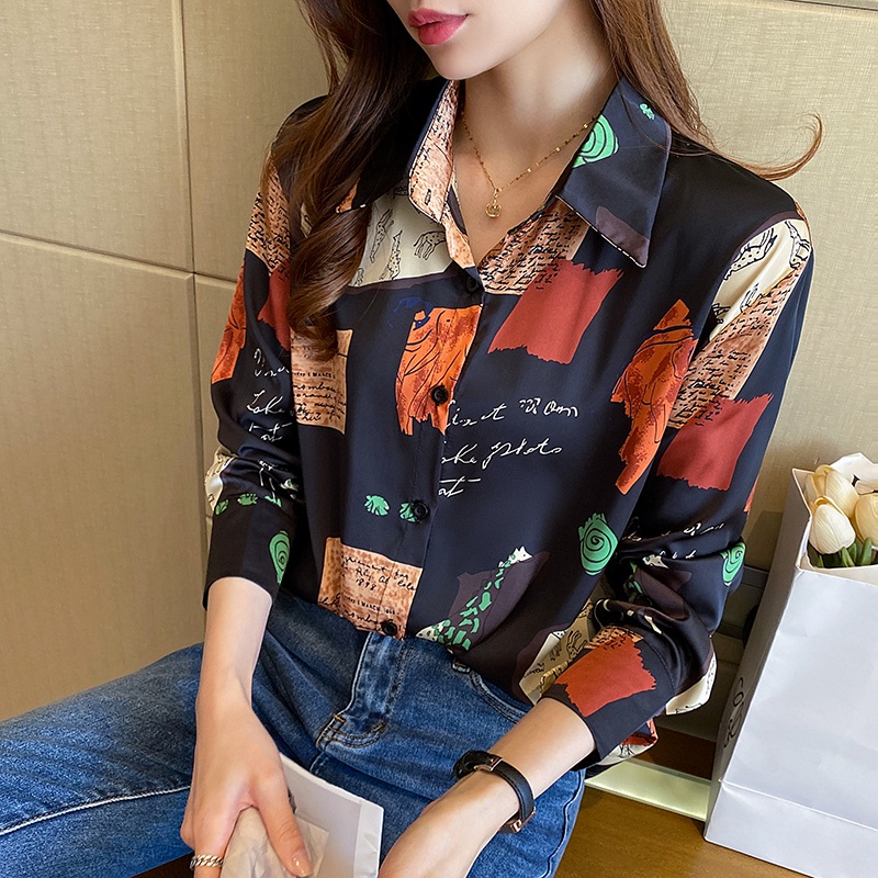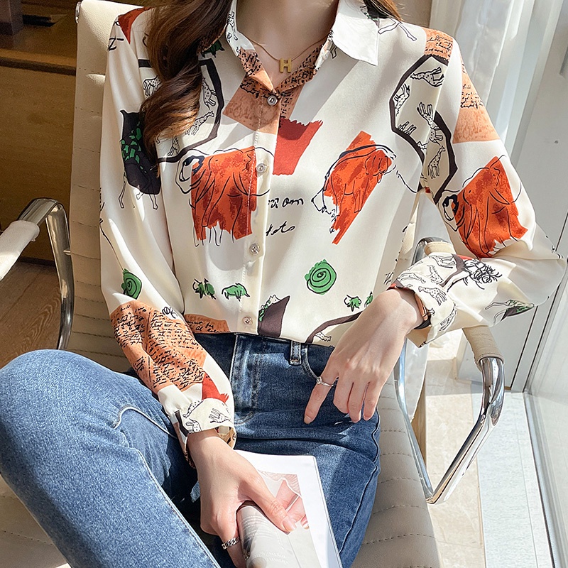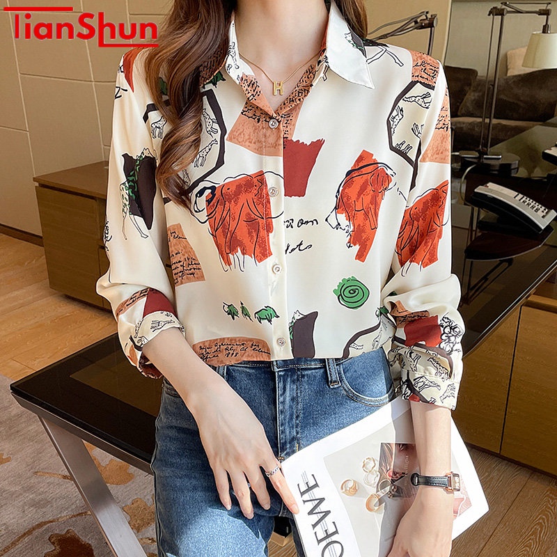 TianShun Korean Fashion Chiffon Soft Fabric Long sleeved Shirt Casual Print Top Women's Casual Shirt