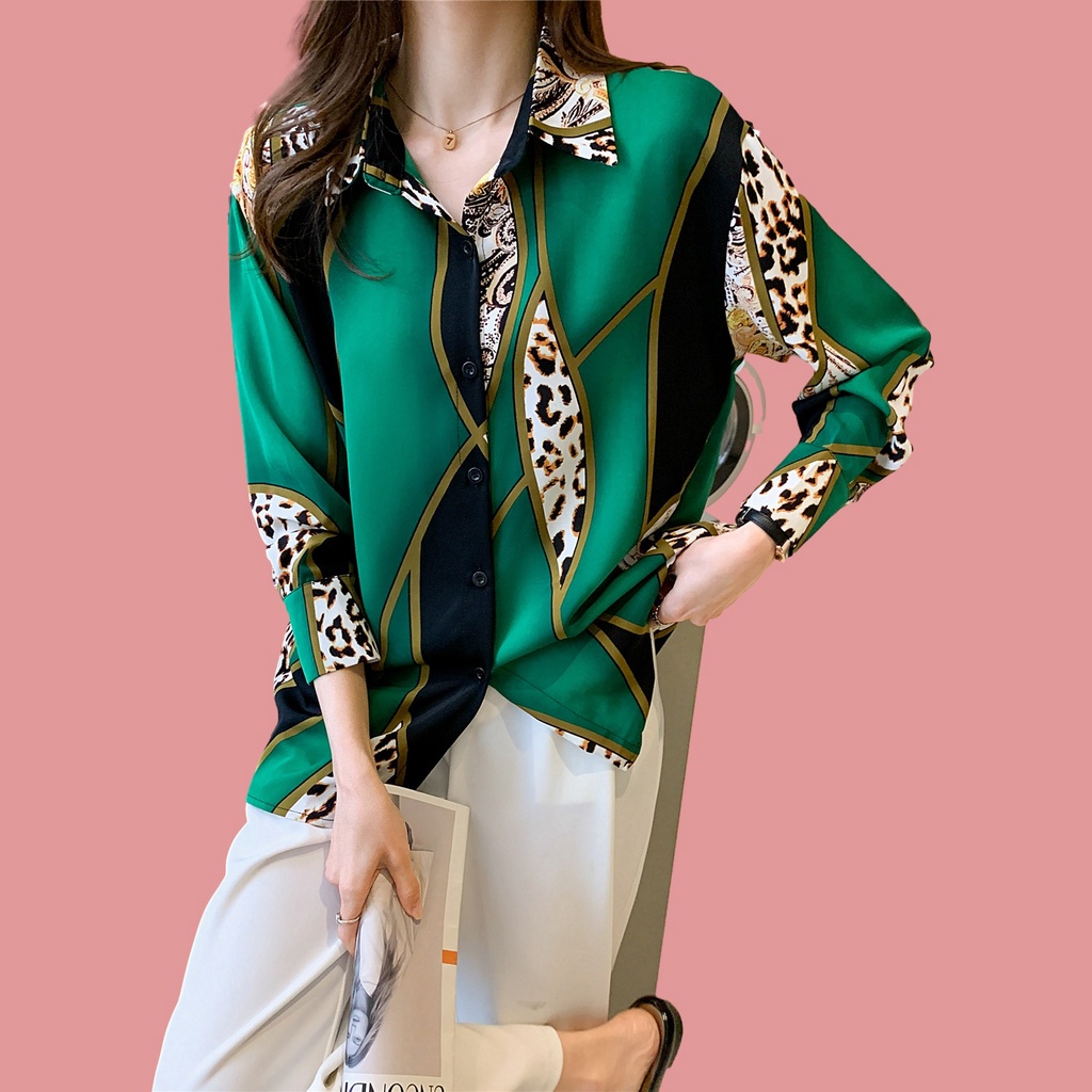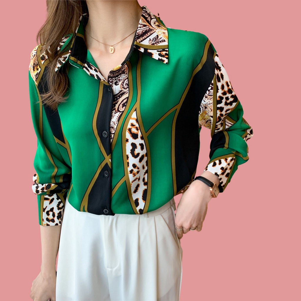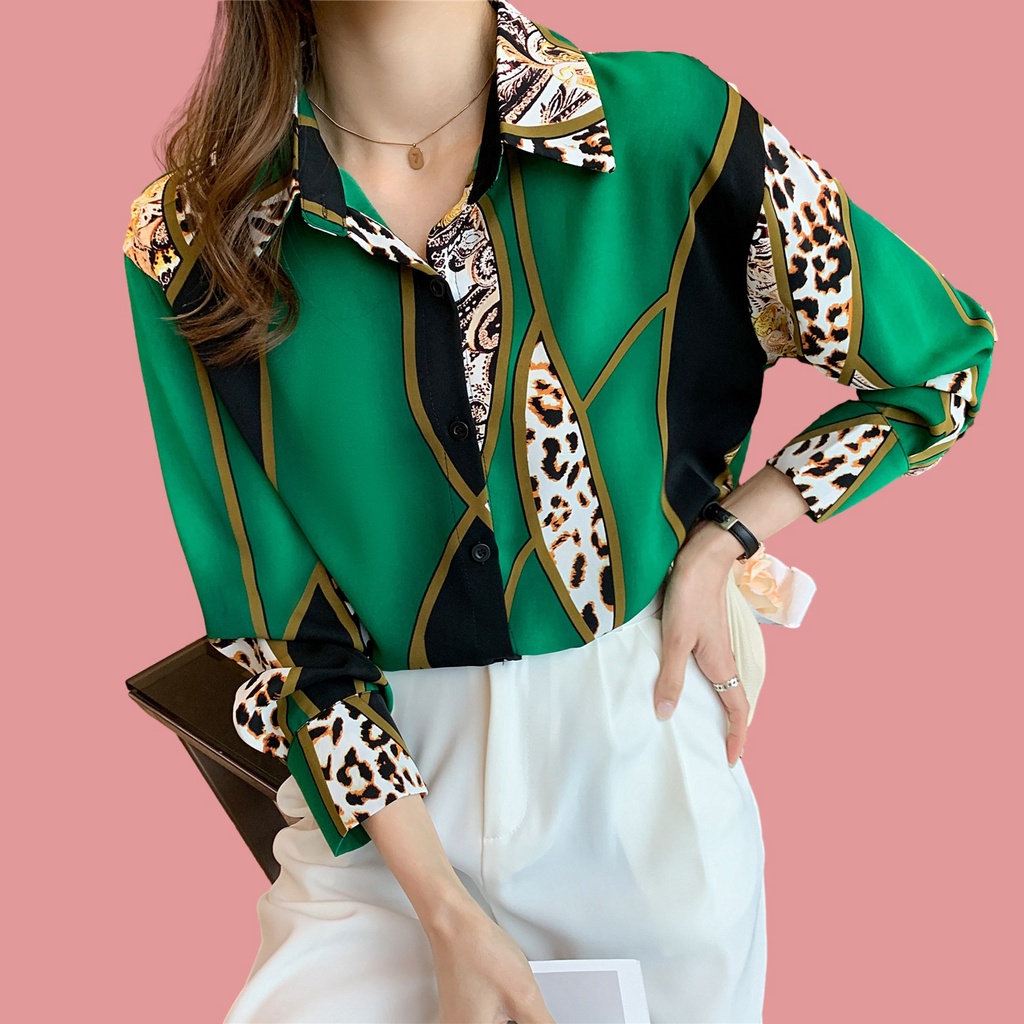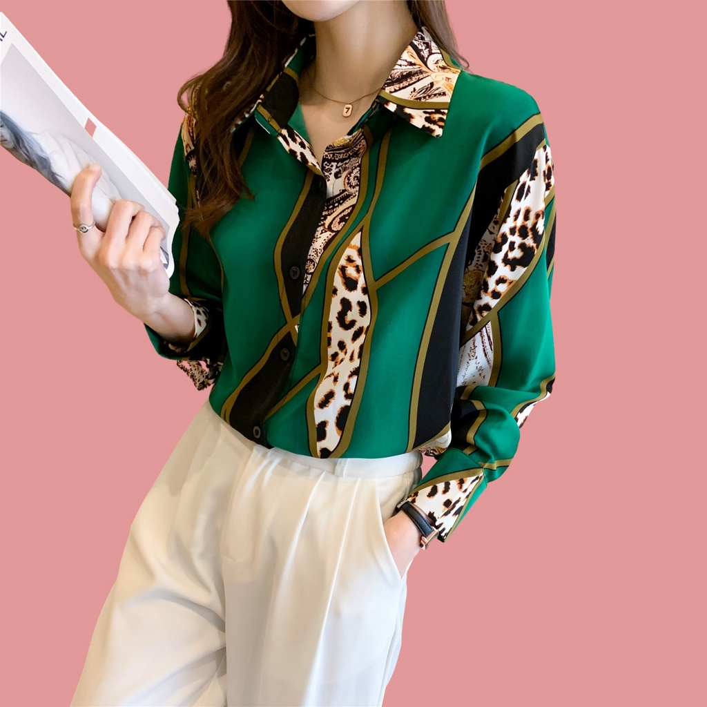 New Fashion Korean Style High Quality Fabric Green Geometric Pattern Chiffon Women Long Sleeve Shirt OL Office Casual Lo