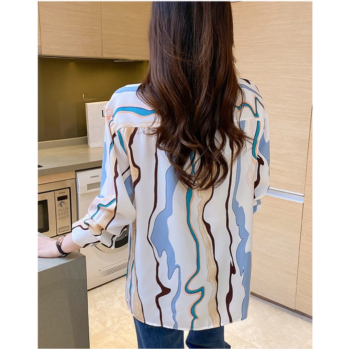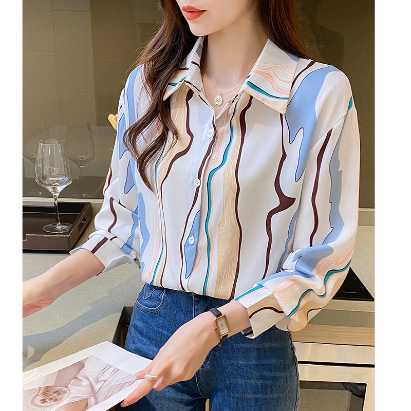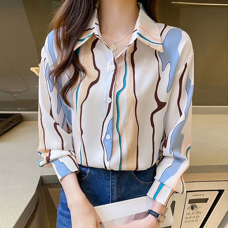 Kualitas Tinggi Sifon Biru Bergaris Kemeja Wanita Lengan Panjang Fashion Korea Atasan Kasual Kerja Sehari-hari