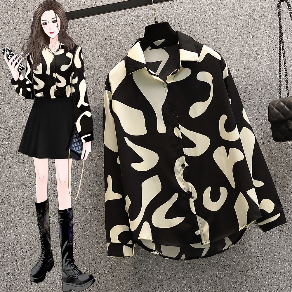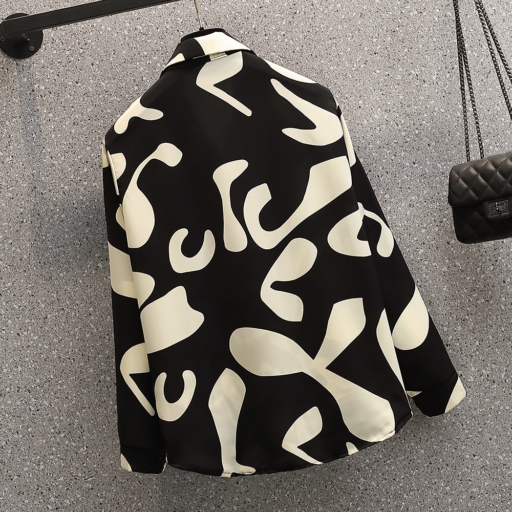 New 2025 Fashion Cetakan Geometris Korea Trendy Kemeja Lengan Panjang Hitam Sifon Berkualitas Tinggi Atasan Wanita Kemej