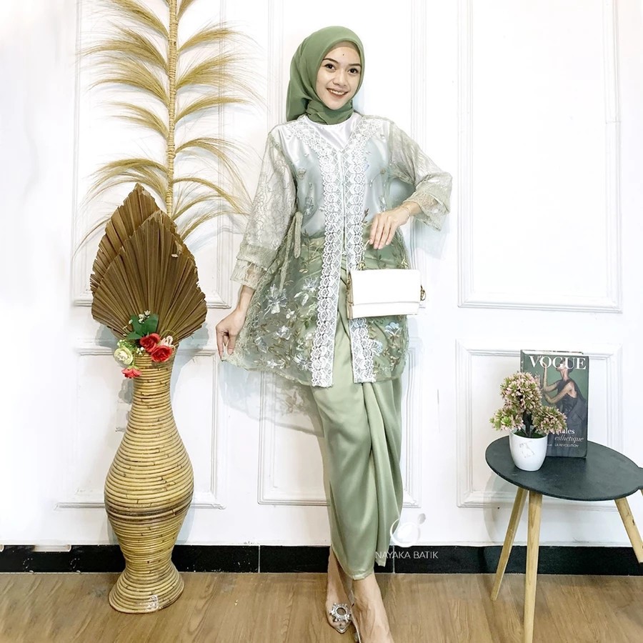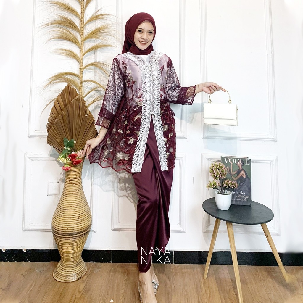 One Set Kebaya Modern Wanita Kekinian Maiza Tulle Gardenia Warna Mix Renda Full Chantily Halus Setelan Inner Outer Rok Cewek Outfit Wisuda