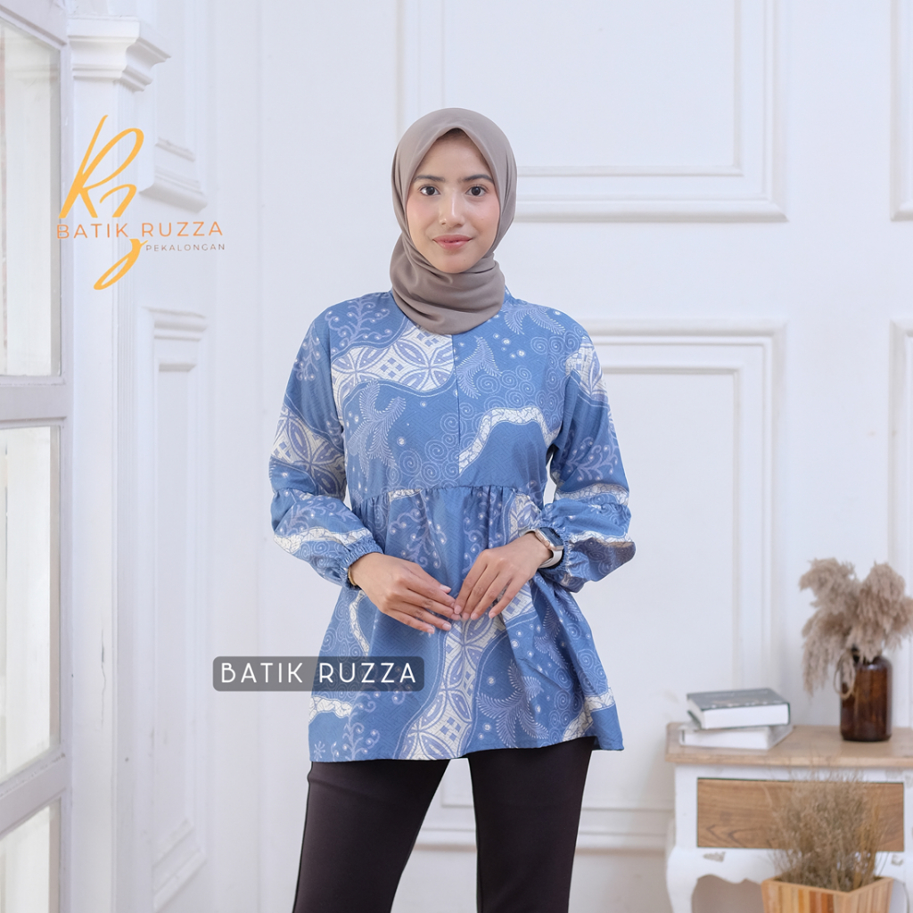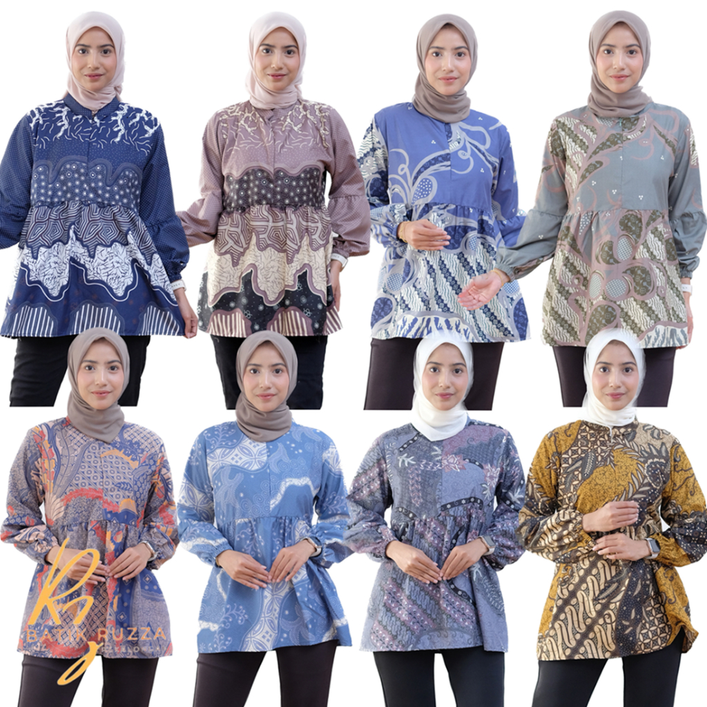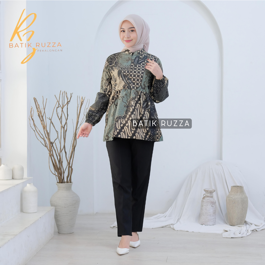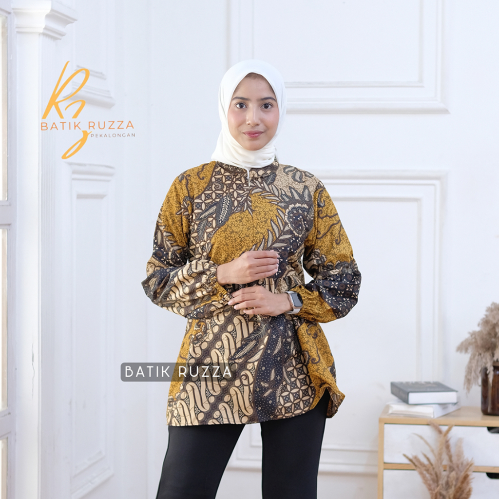 RUZZA Batik Wanita Blouse Atasan Resleting Depan Lengan Panjang Balon S M L XL XXL XXXL Jumbo