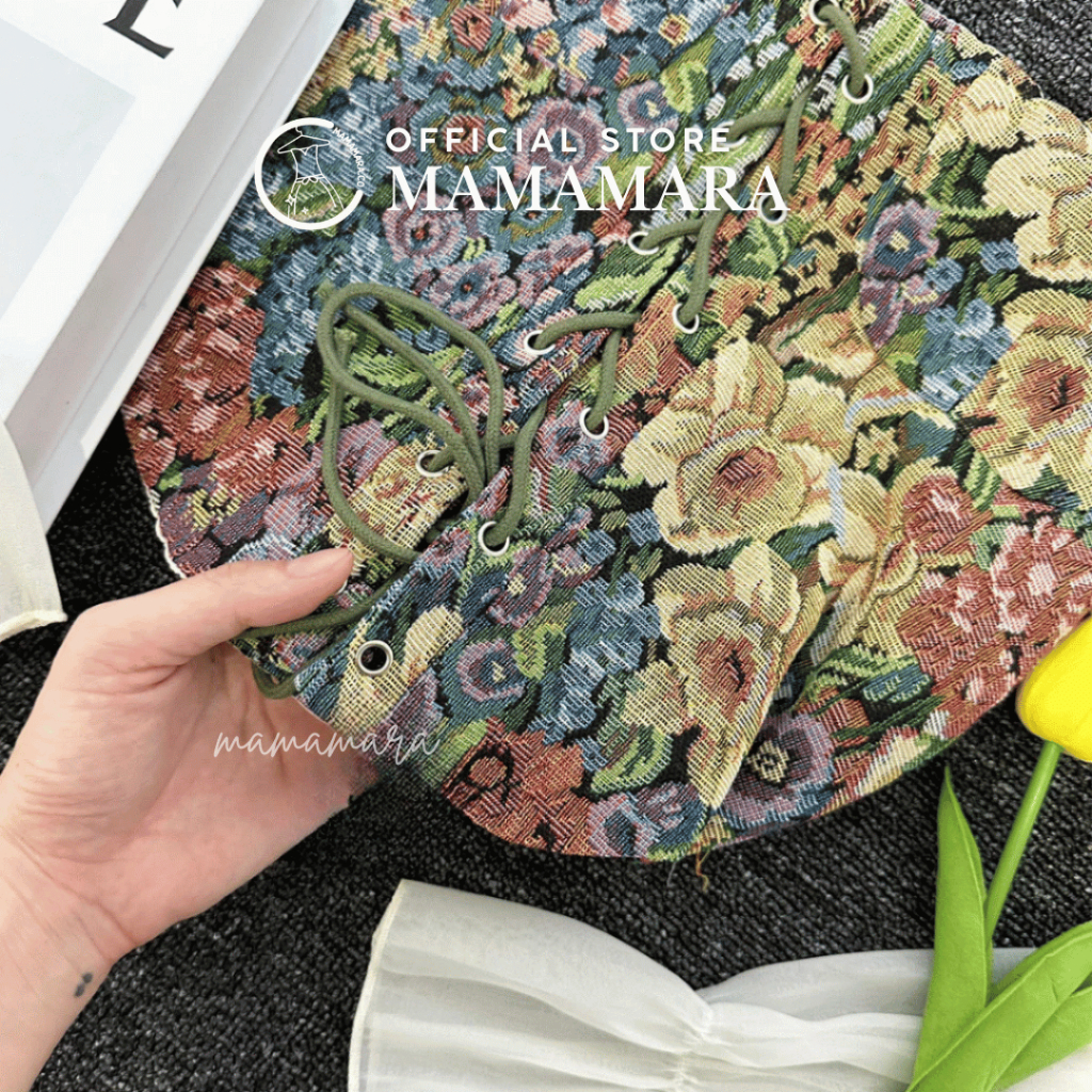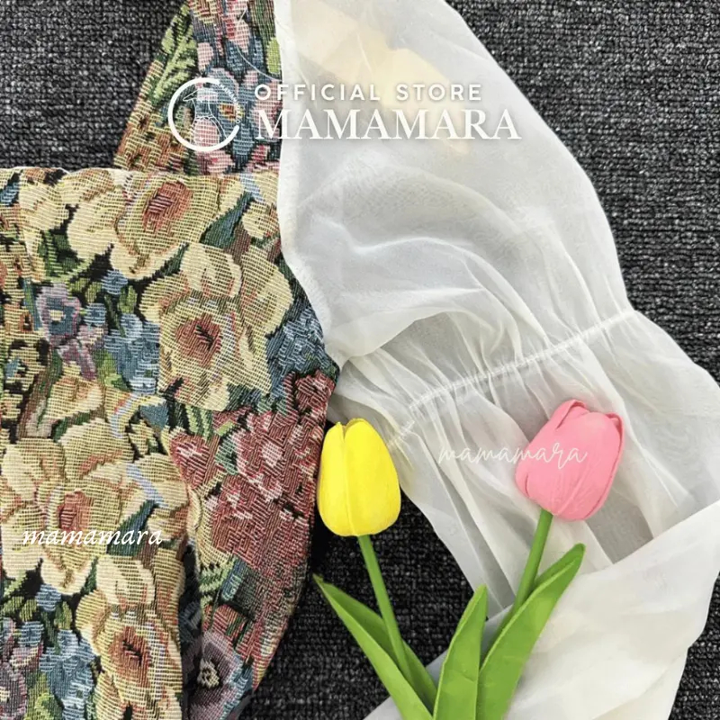 MAMAMARA - Atasan Baju Crop Karet Kemeja Wanita Vintage Top Doll Tenun Bunga Slim-Fitting Ala Korea