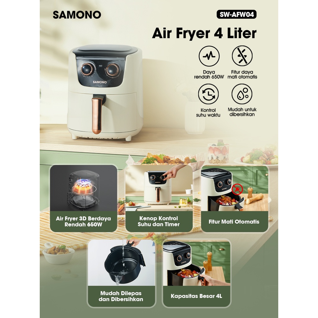 SAMONO Air Fryer 4L 650 watt Low Watt Menggoreng Tanpa Minyak Touch Screen memiliki 7 Tipe Memasak SW-AFW04 White GARANS