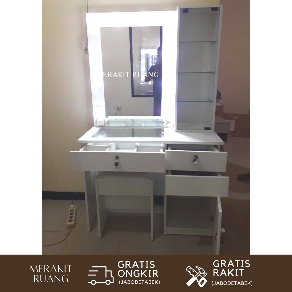 Meja rias premium vanity mirror terang 5 laci plus satu dengan rak kaca make up elegan, murah