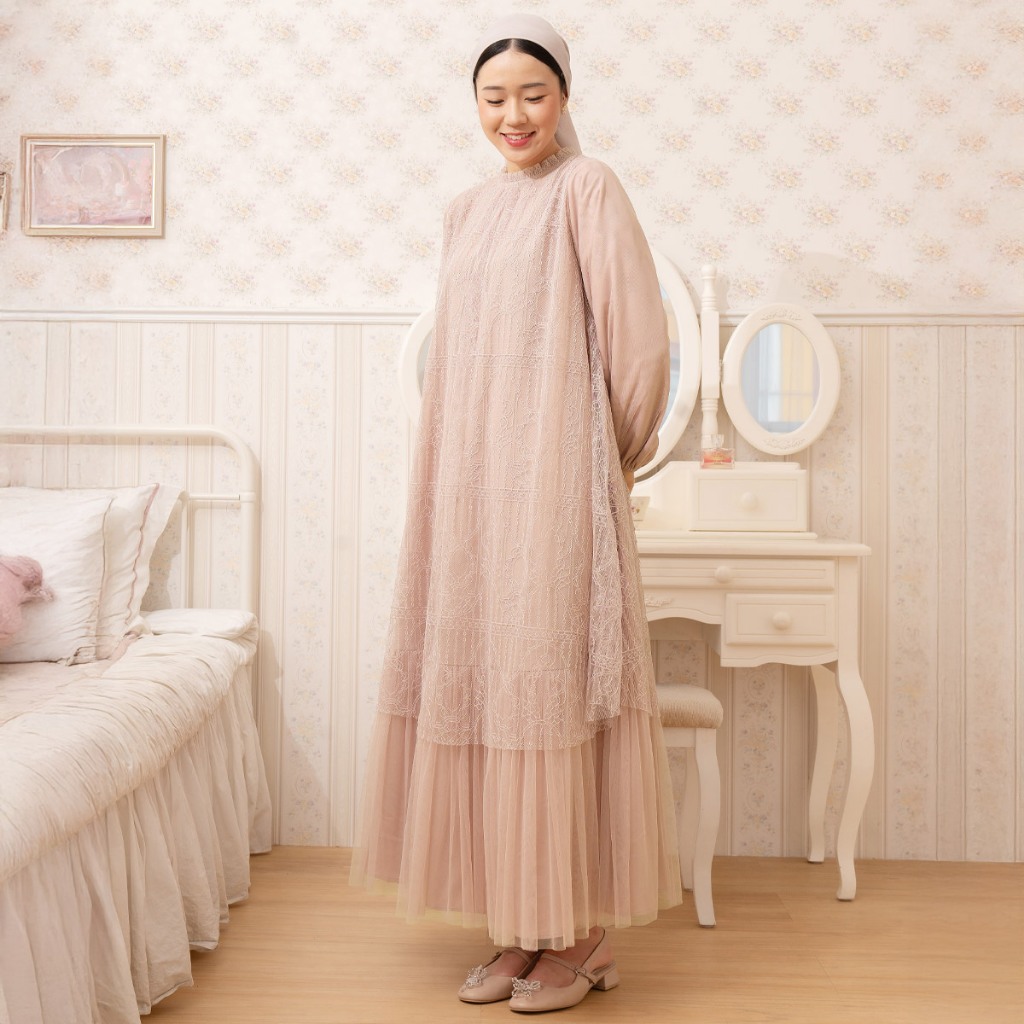 HijabChic Syahira Pink Nude Dress - Gaun Brukat Tulle Kondangan Elegan Best Seller