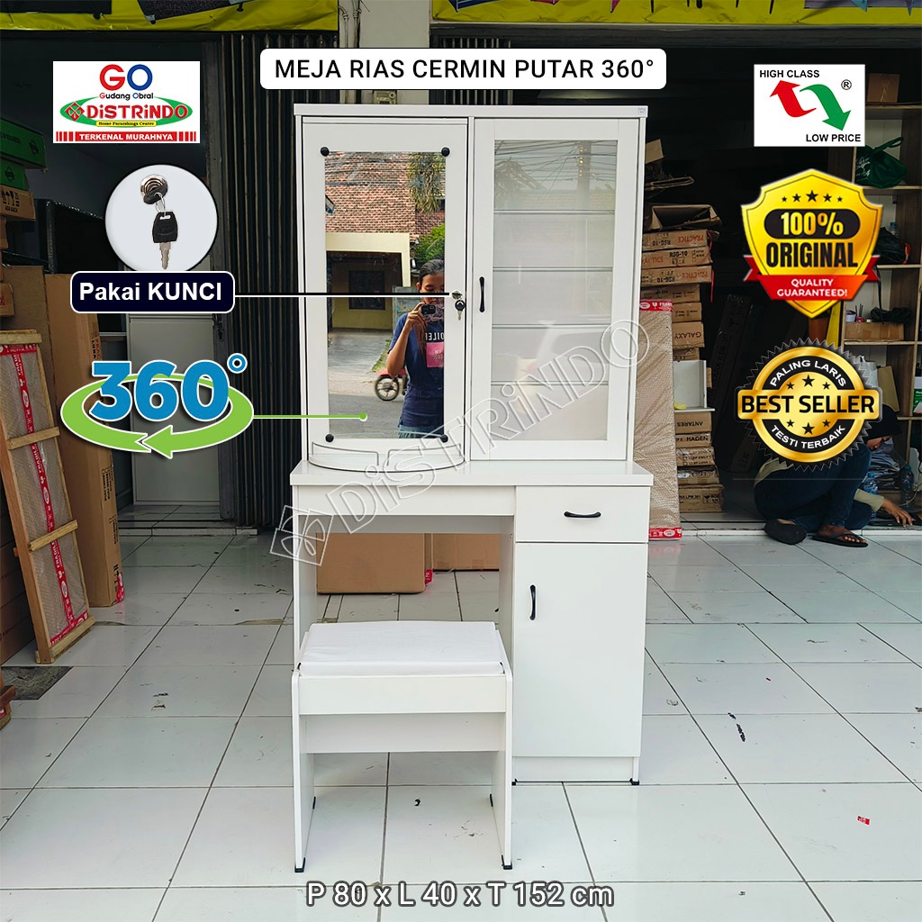 Distrindo - Meja Rias Murah dapat Kursi / Bangku, Rak dengan Pintu Kaca + Laci dan Lemari