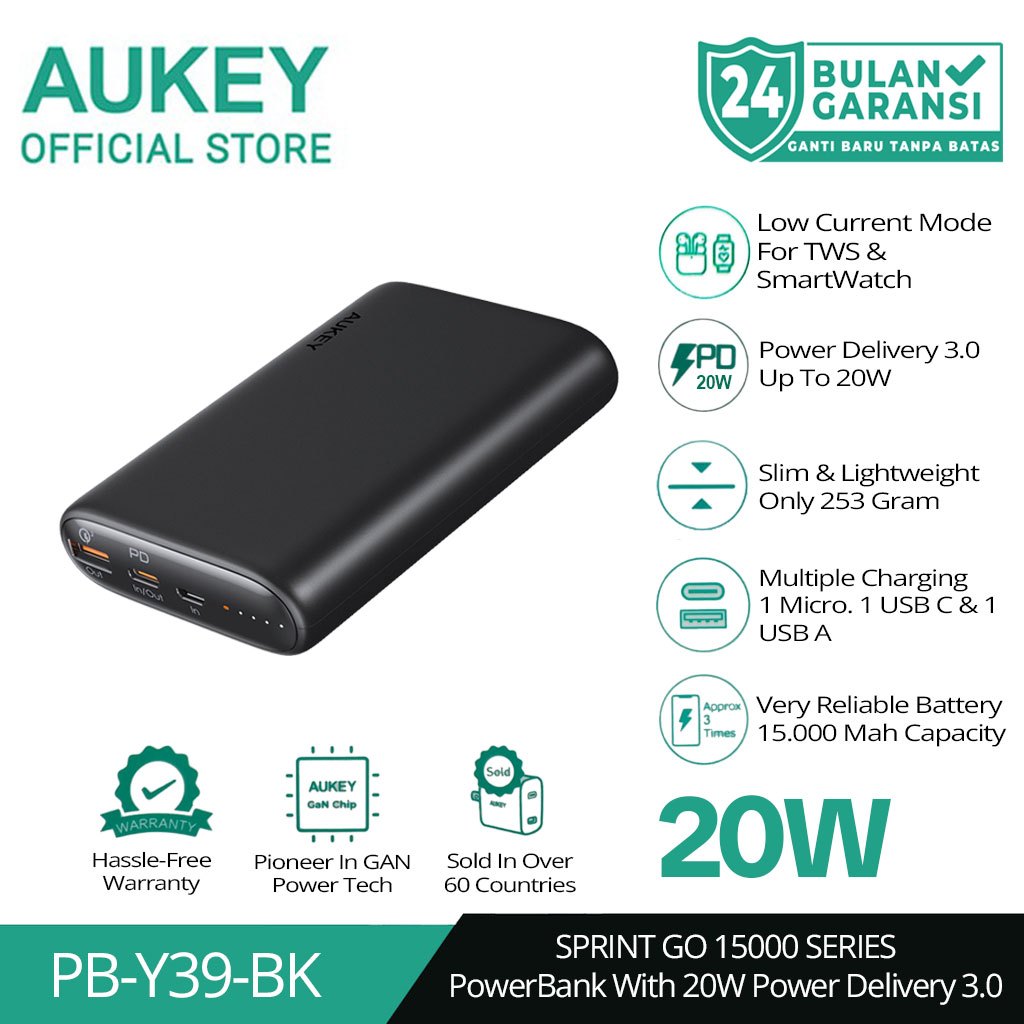 AUKEY Powerbank 15000mah USB C 20W PD 3.0 Slim PB-Y39-BK