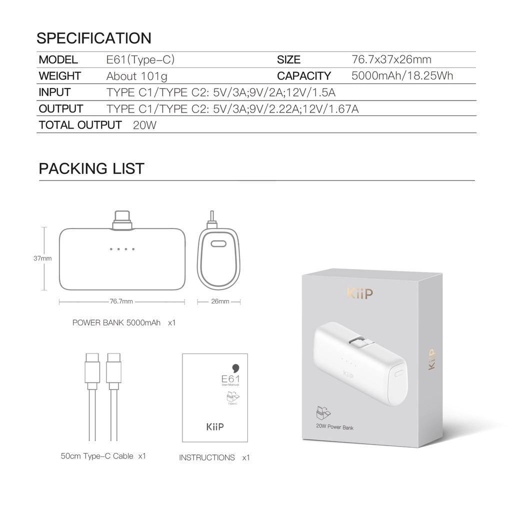 KiiP E61 Mini PowerBank Fast Charging PD 20W Type-C Lightning 5000mAh