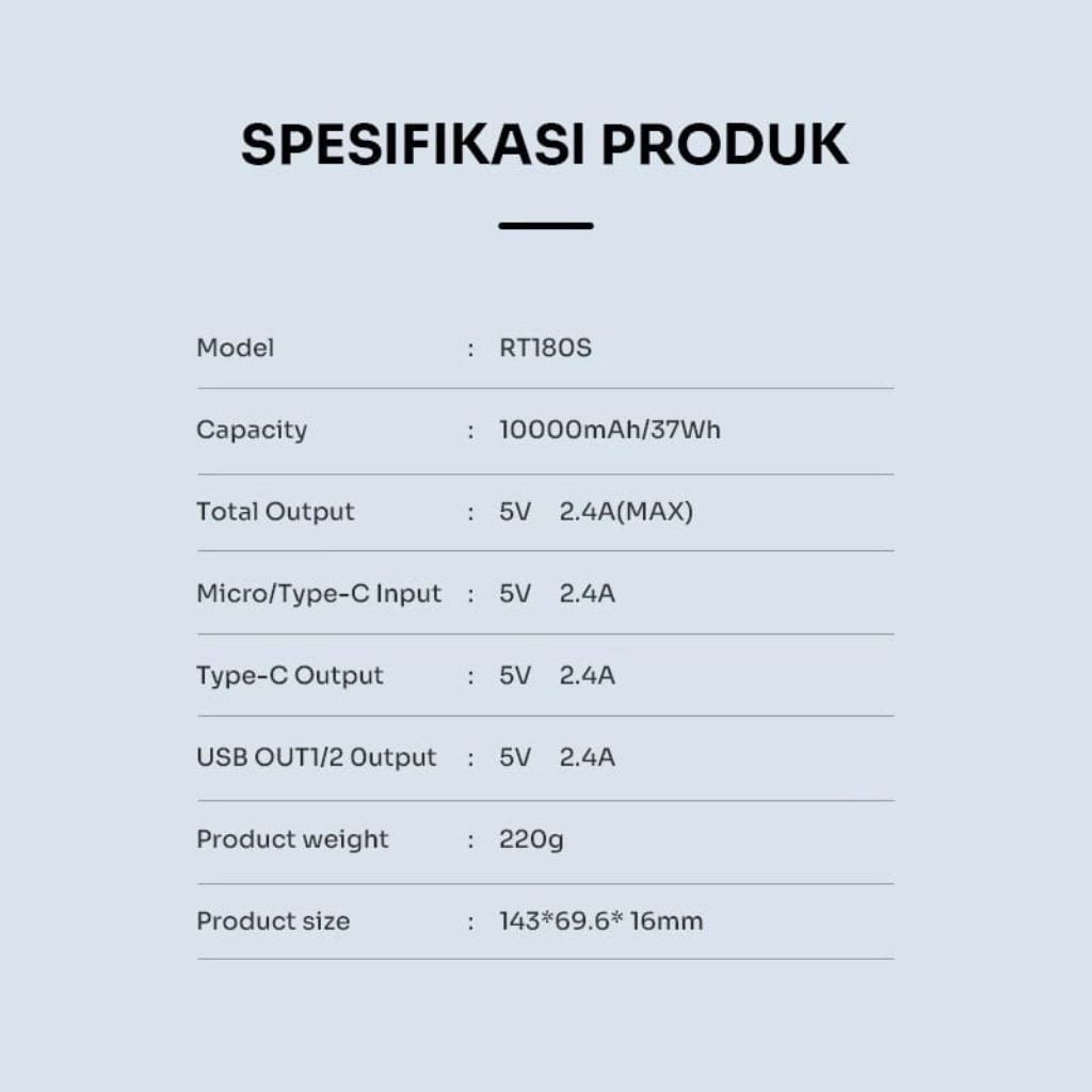 Powerbank Robot RT180 S 3 Output USB-A+C Slim 10000mAh Original
