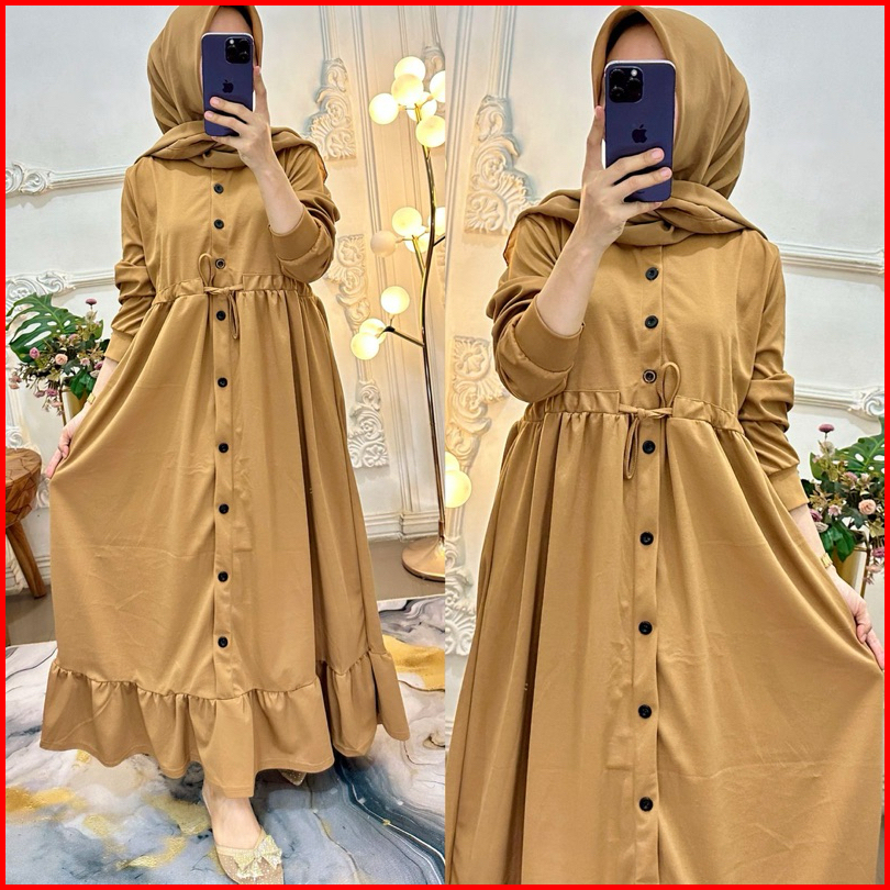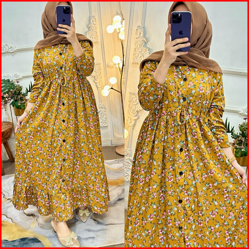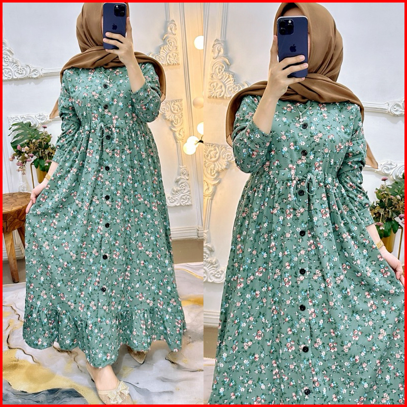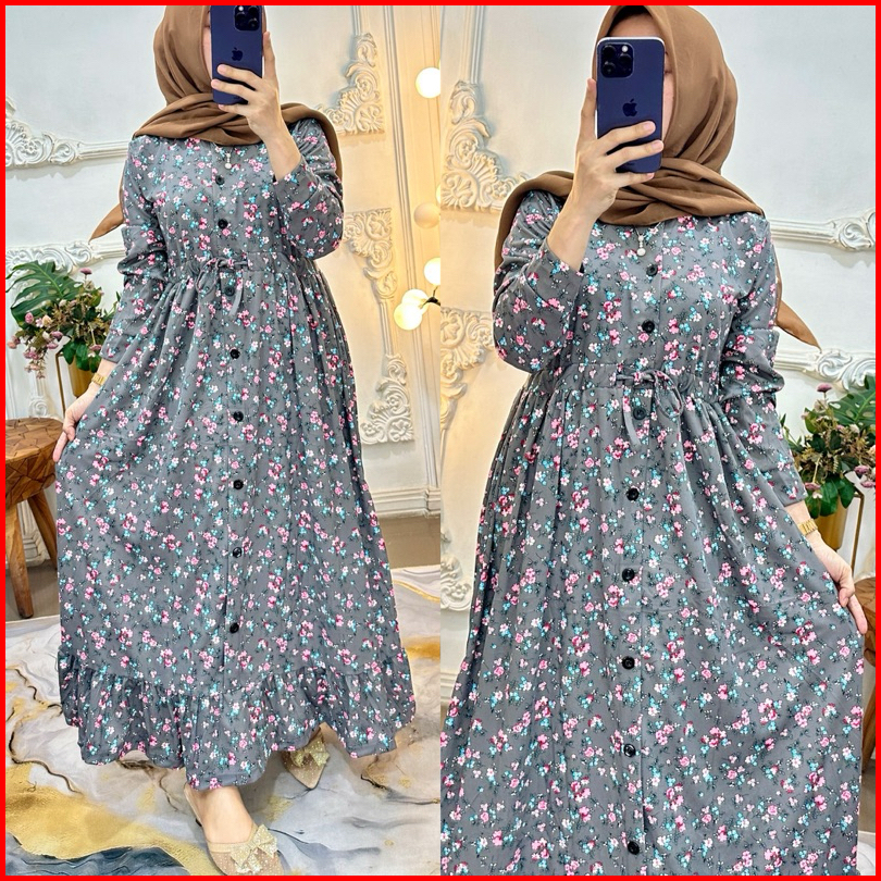 Gamis Bunga Serut Kancing Muslimah Panjang Nyaman Wanita Rempel