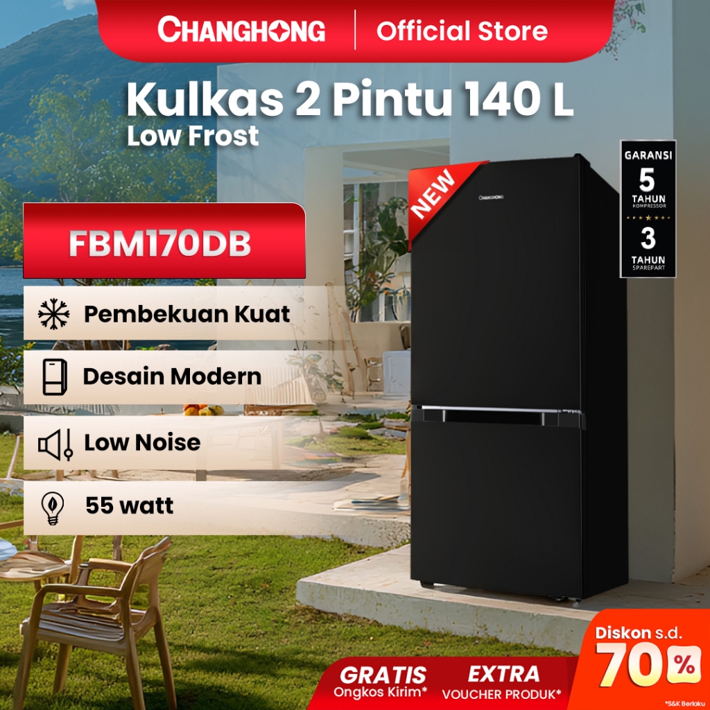 Changhong Kulkas 2 Pintu (Bottom Mounted Refrigerator) Lemari Es Kapasitas 140 Liter FBM170DB Black (Semi Auto Defros