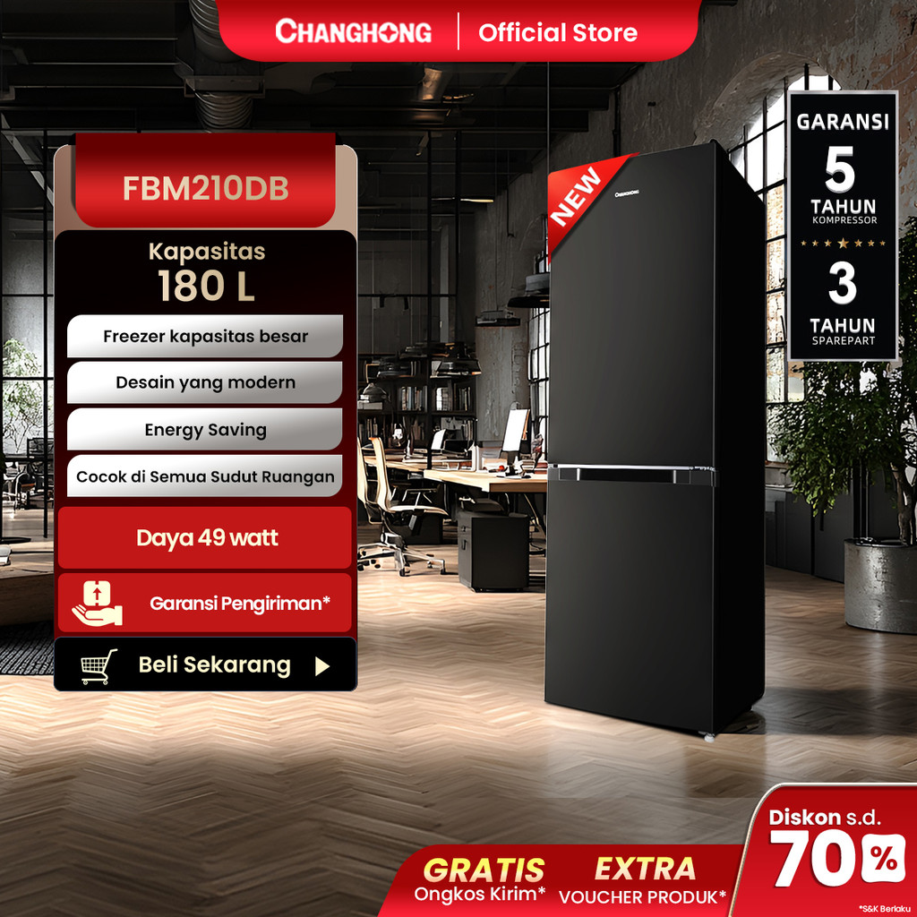 New Changhong Kulkas 2 Pintu (Bottom Mounted Refrigerator) Lemari Es Kapasitas 180 Liter FBM210DB