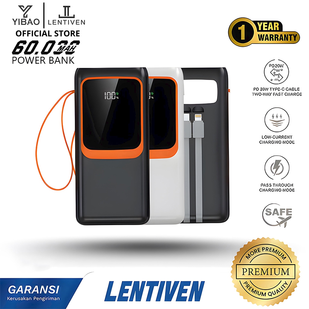 YIBAO LENTIVEN Powerbank 60000Mah With Cable Type C Lightning Fast Charging Led Indikator Display