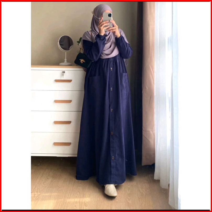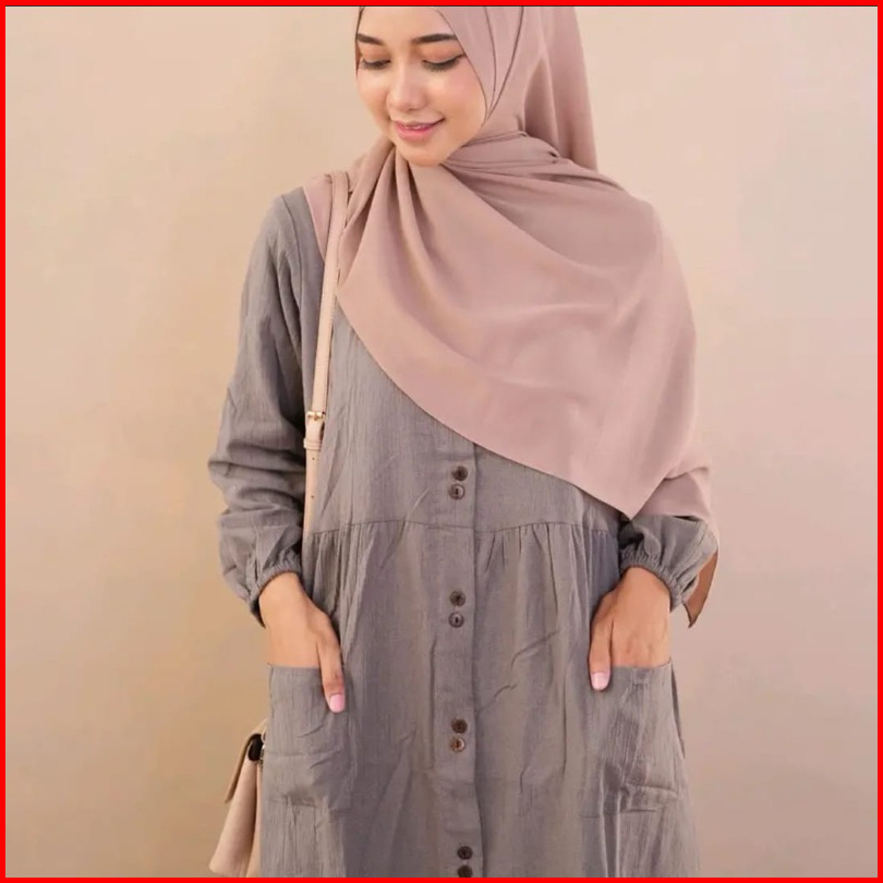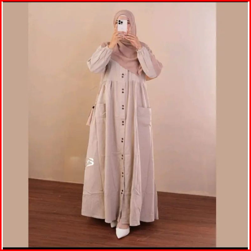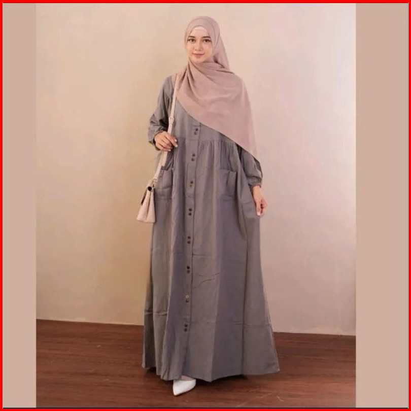 Azzura Dress Gamis Pesta Syari Pengajian Wanita Terbaru Jubah Kekinian Cotton Rami Full Kancing Depan Tangan Karet Serut