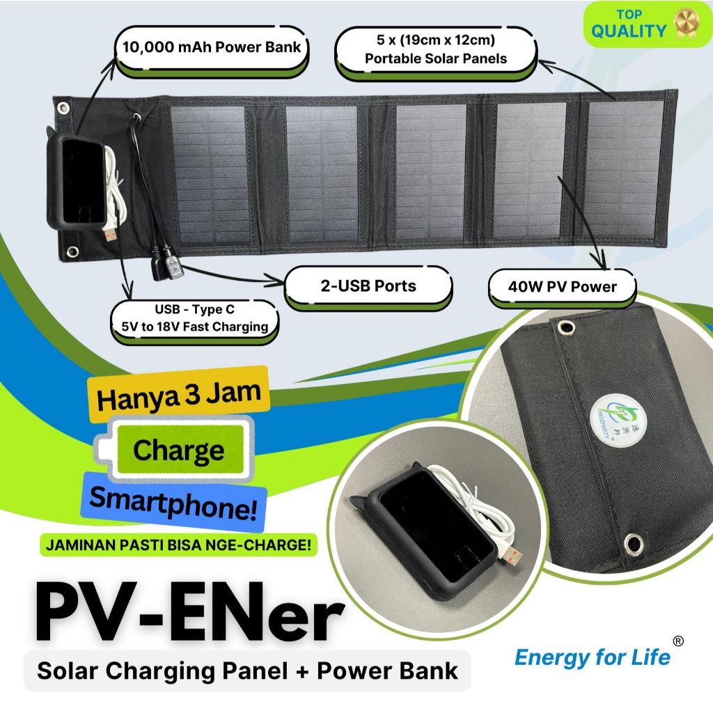 PV-ENer Portable Solar Charging 5V 40Watt 5-Panel 2USB Port (+ Powerbank 10,000mAh) Waterproof Solar