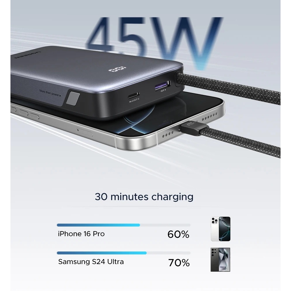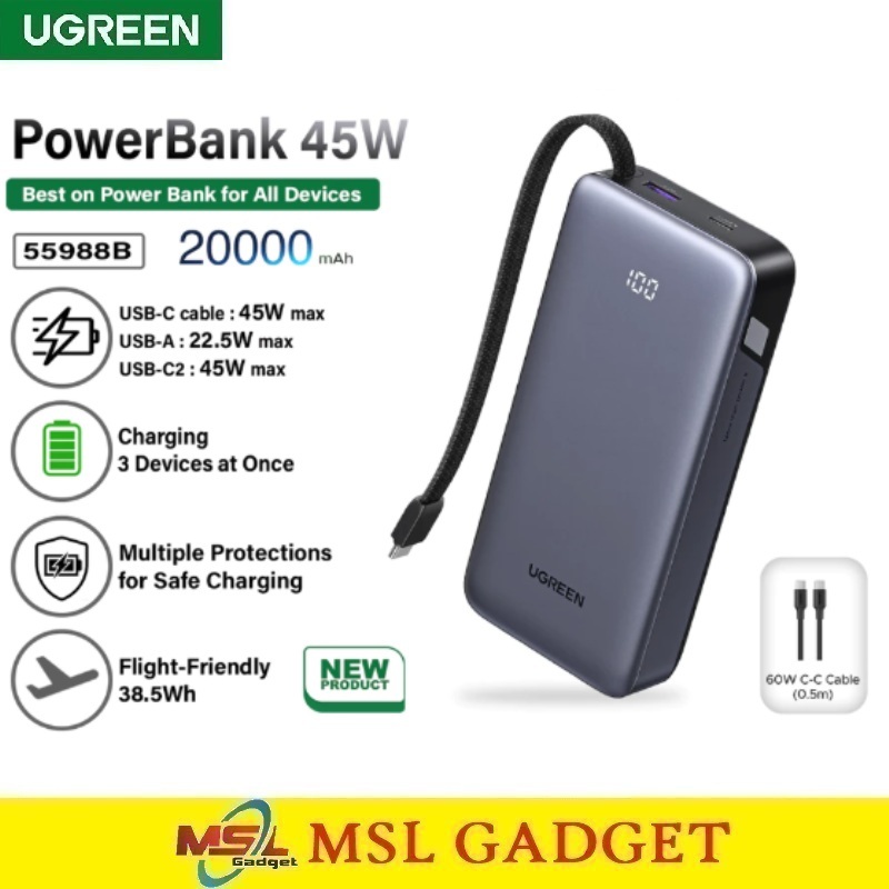 UGREEN Powerbank 20000mAh 45W Built-in Cable USB Type C PD SFC Super Fast Charging