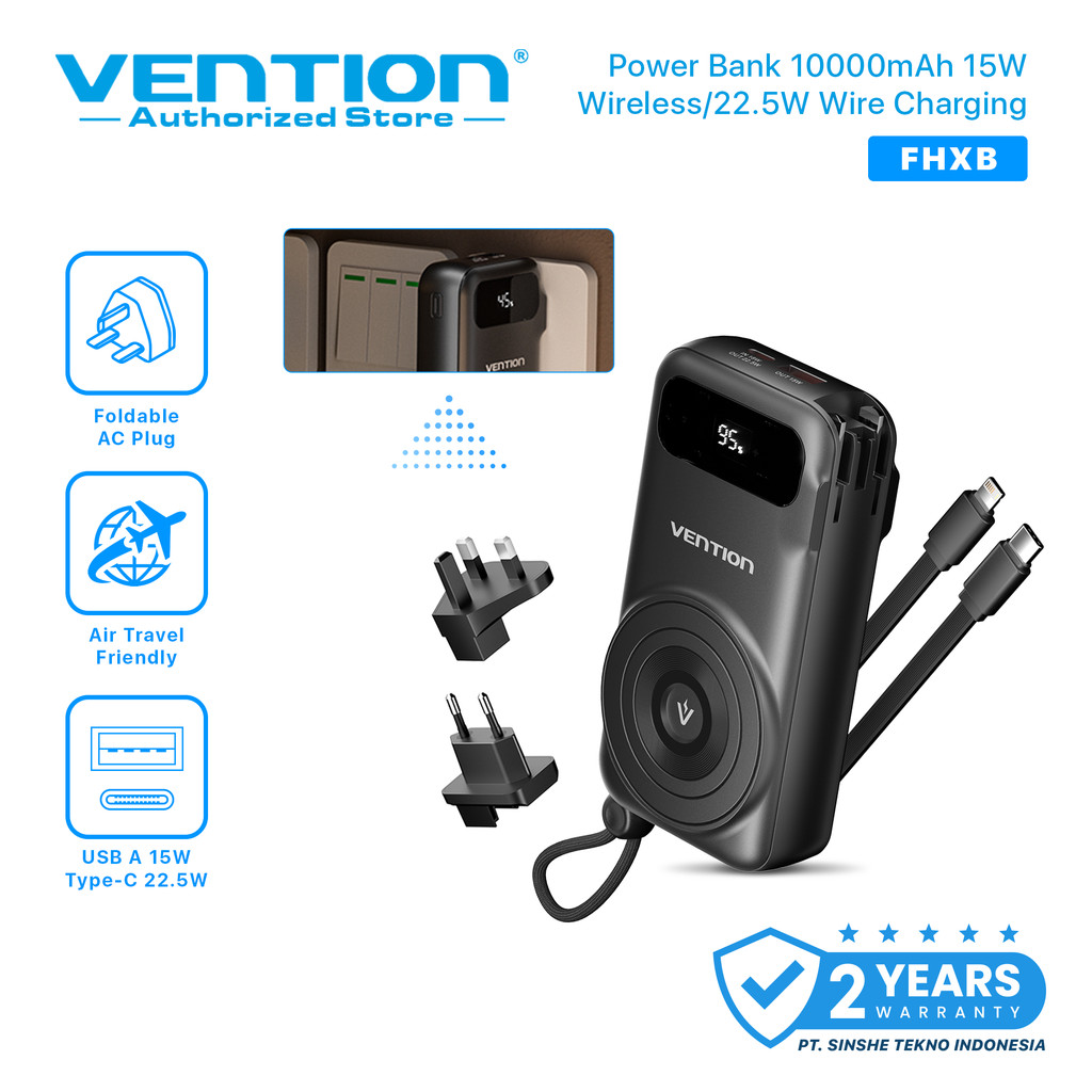 Vention Travel Charger Powerbank Wireless with Built in Type C Lightning Cables & AC Plug 22.5W 10000mAh
