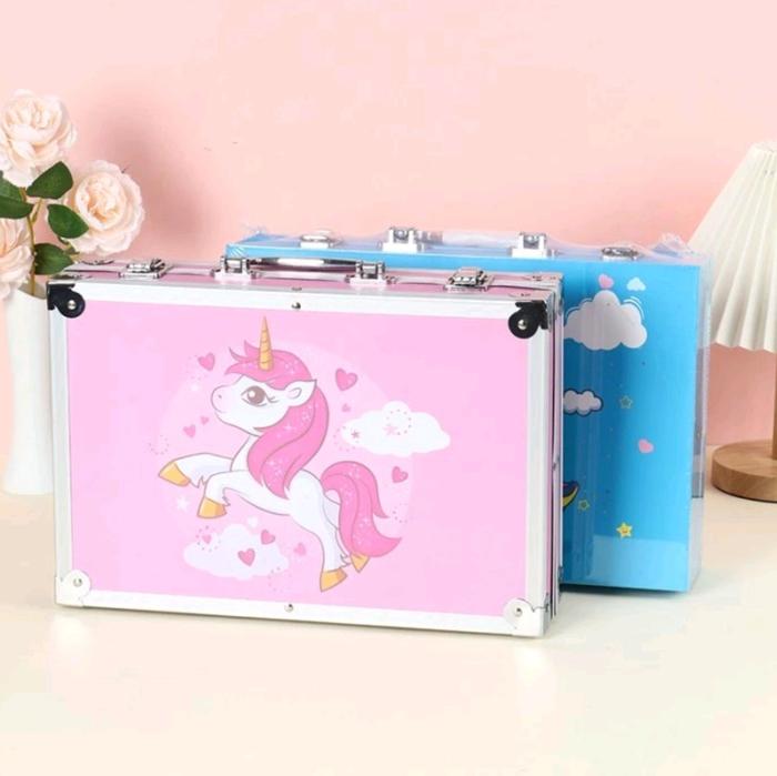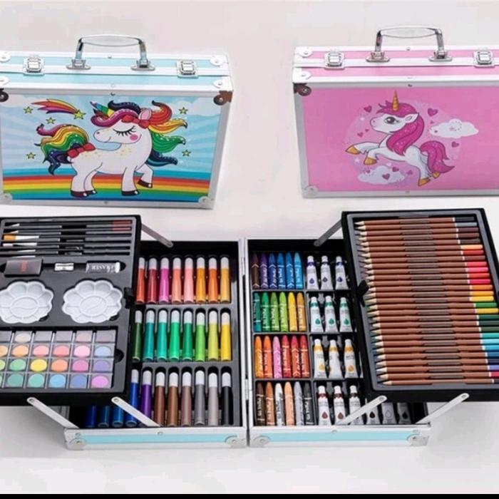 alat mewarnai koper besi crayon pensil warna spidol marker dan cat air 145 psc - biru