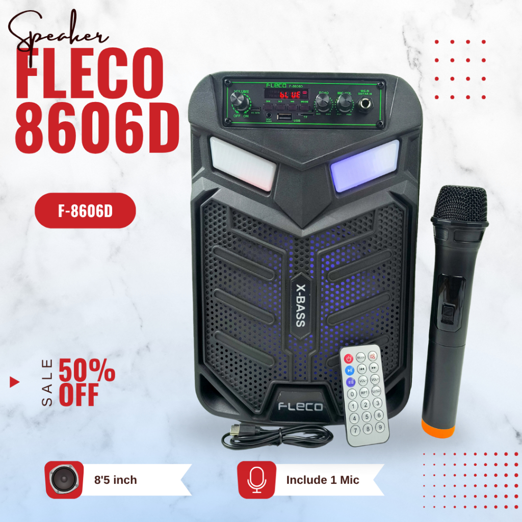 Speaker Bluetooth 5.0 Karaoke Wireless Fleco F 8606D 8,5 Inch Gratis (MIC WIRELES + REMOT KONTROL) LED Mode Display BASS