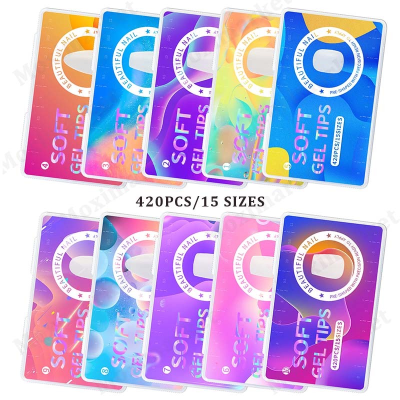 420Pcs/15 Size Soft Gel Rainbow Tip Nail Extension Kuku Palsu Soft Gel Tip Scrub Terasa Full Buff Nail Extension Kuku Palsu