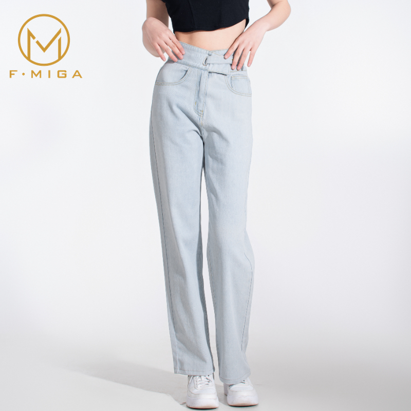F·MIGA C33 Korean Style Wanita High kasual Kulot Bagy Jeans Panjang Celana Jeans Wanita - Biru Muda