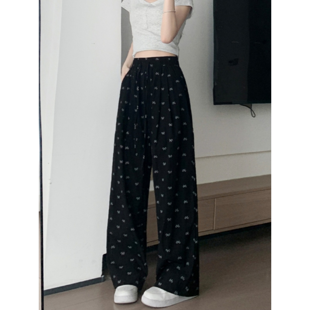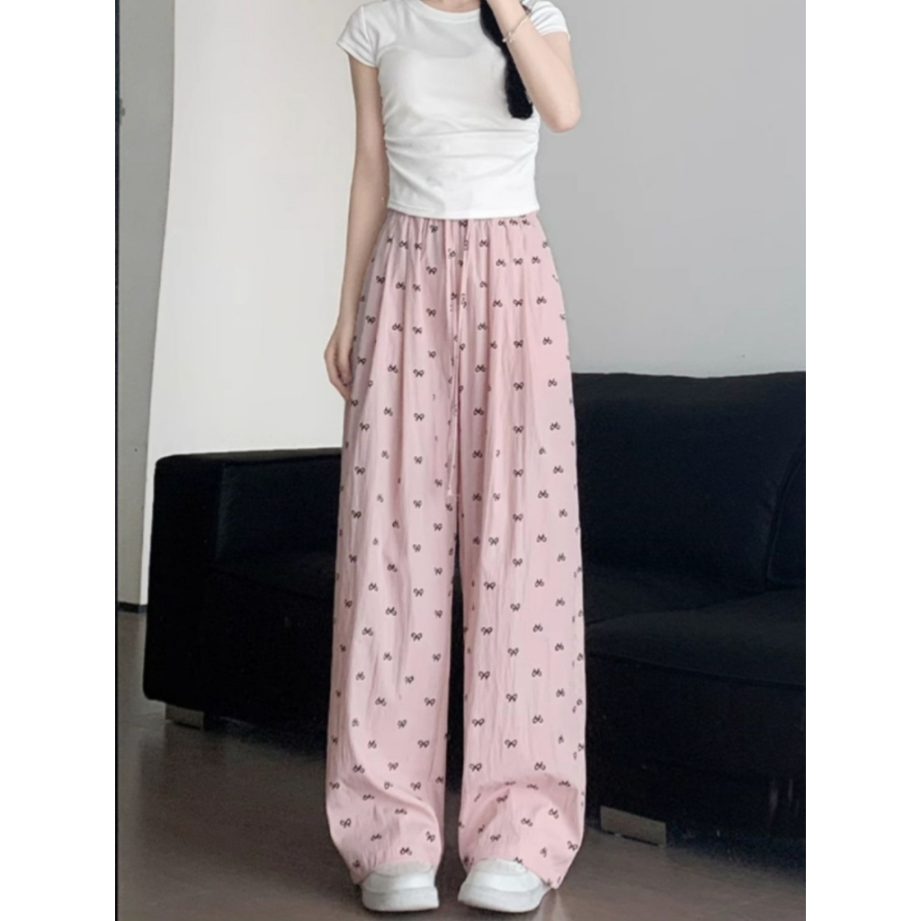 2toyoung NLONKE-Celana Kasual Motif Pita Celana Kaki Lurus LonggarWanita Celana Kaki Lebar Tali Serut celana wanita