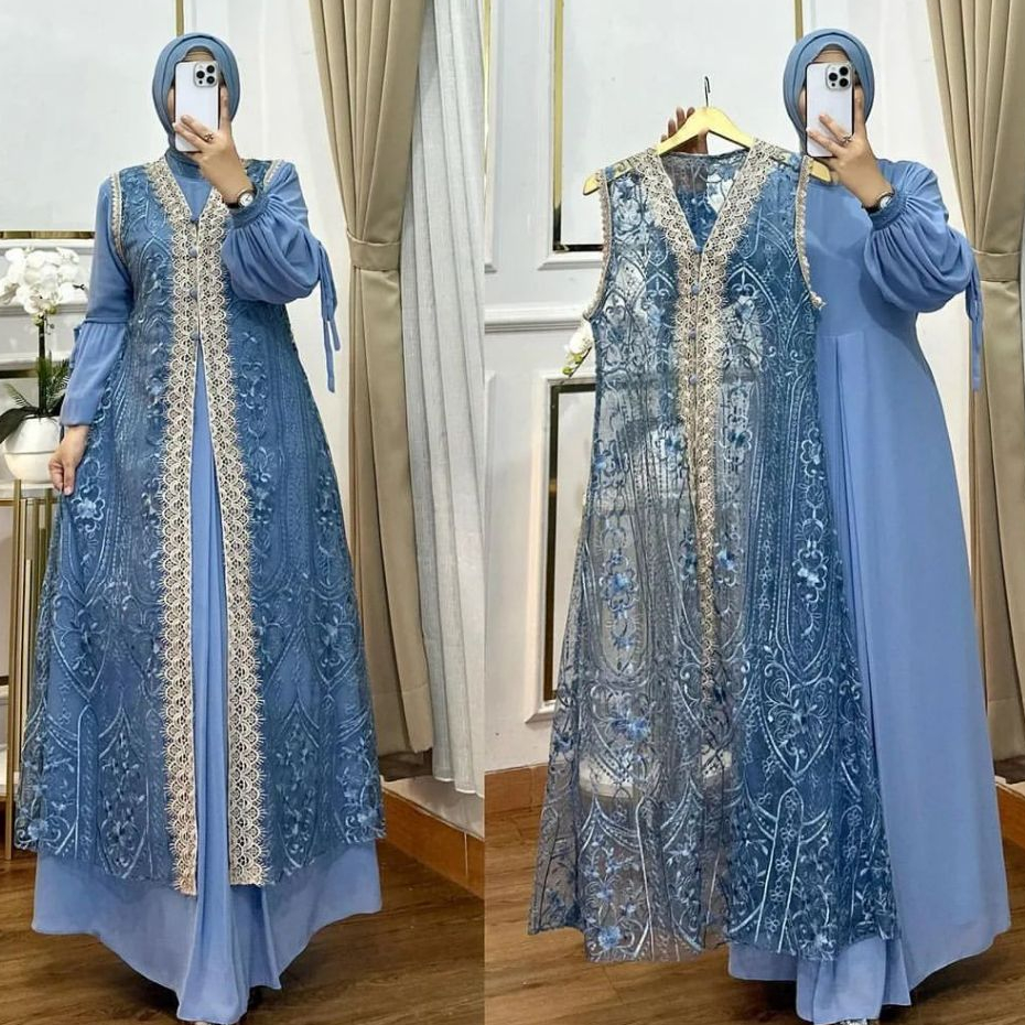 Gamis Dress Muslim Brokat Wanita Kekinian Inner Outer Terbaru 2024 Baju Pesta Kondangan Mewah Elegan