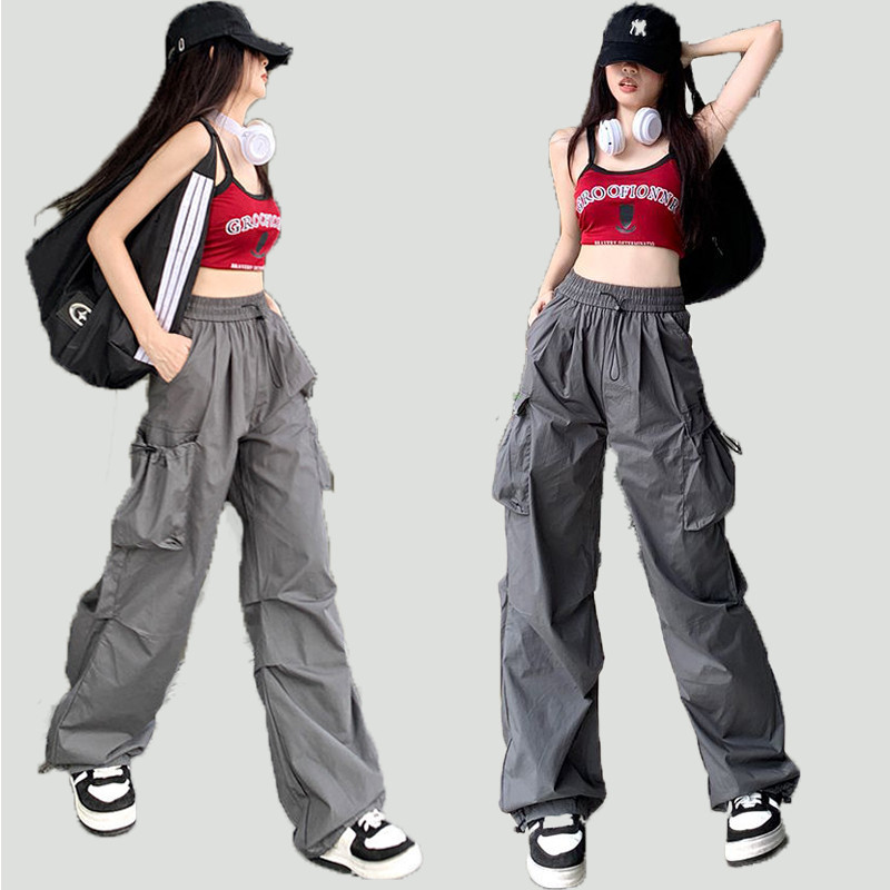 S5XL Celana Cargo Retro Wanita Celana Kasual Longgar Pinggang Tinggi Gaya Korea Celana Olahraga Banyak Saku