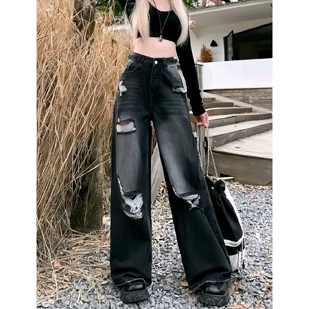 CELANA BAGGY JEANS SOBEK RIPPED UNISEX HIGHWAIST KULOT JEANS RIPPED LOOSE CELANA PANJANG JEANS DENIM KOREAN STYLE