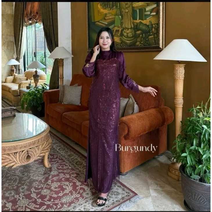 Gamis Kondangan Wanita Remaja Model Press Body Bahan Satin Mix Brukat Premium Warna Mahogany S-XXL