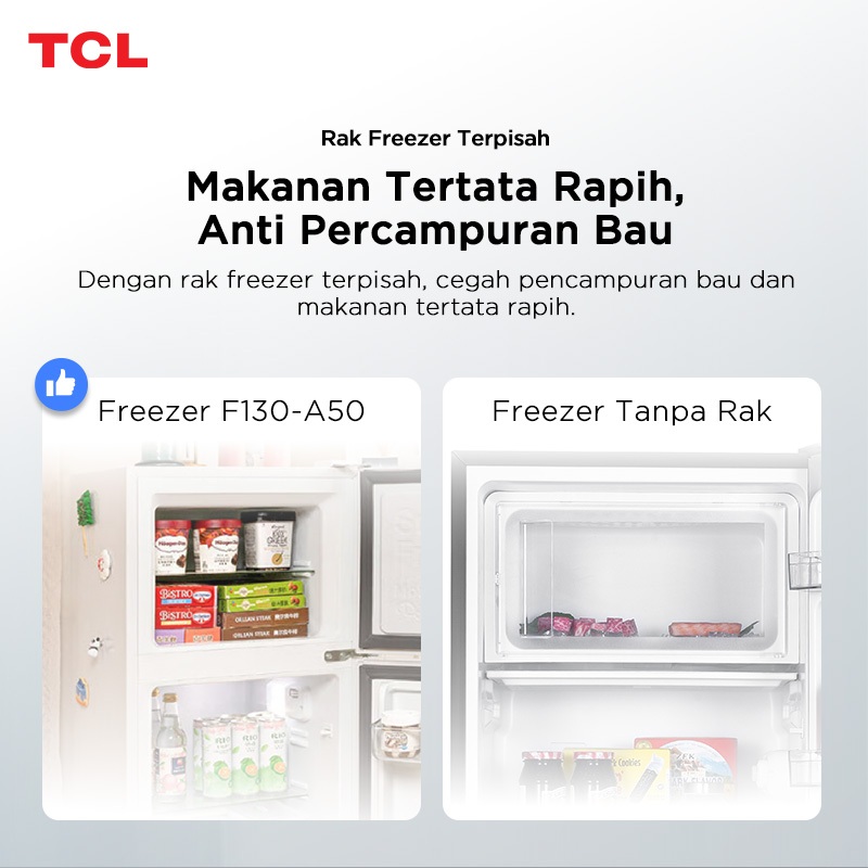 TCL Kulkas 2 Pintu (F130-A50) - Kapasitas 118L - Rak Freezer Terpisah - 3D Surround Cooling - Adjustable shelves - Low N
