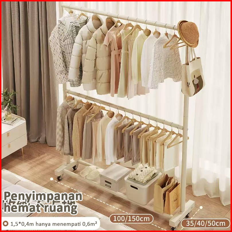 Rak Gantungan Baju Besi 2 Susun Rak Jemuran Atas Dan Bawah Ganda Portable Jemuran Pakaian Berdiri Gawang Baju Estetik