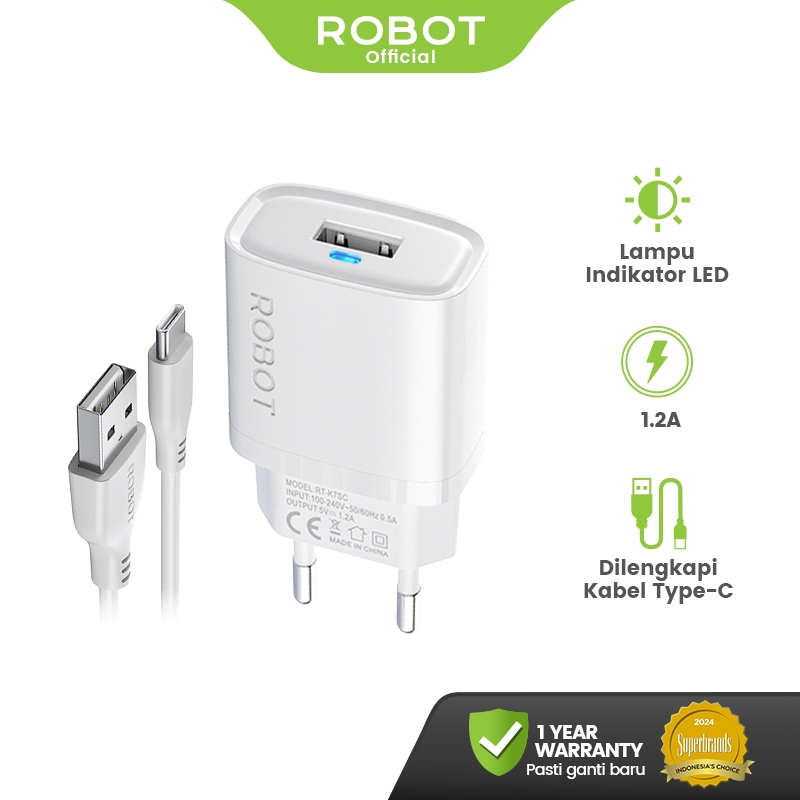 ROBOT Charger 1.2A Lampu Indikator LED with Type-C Cable Casan Android Smart Phone Charger RT-K7SC Ori