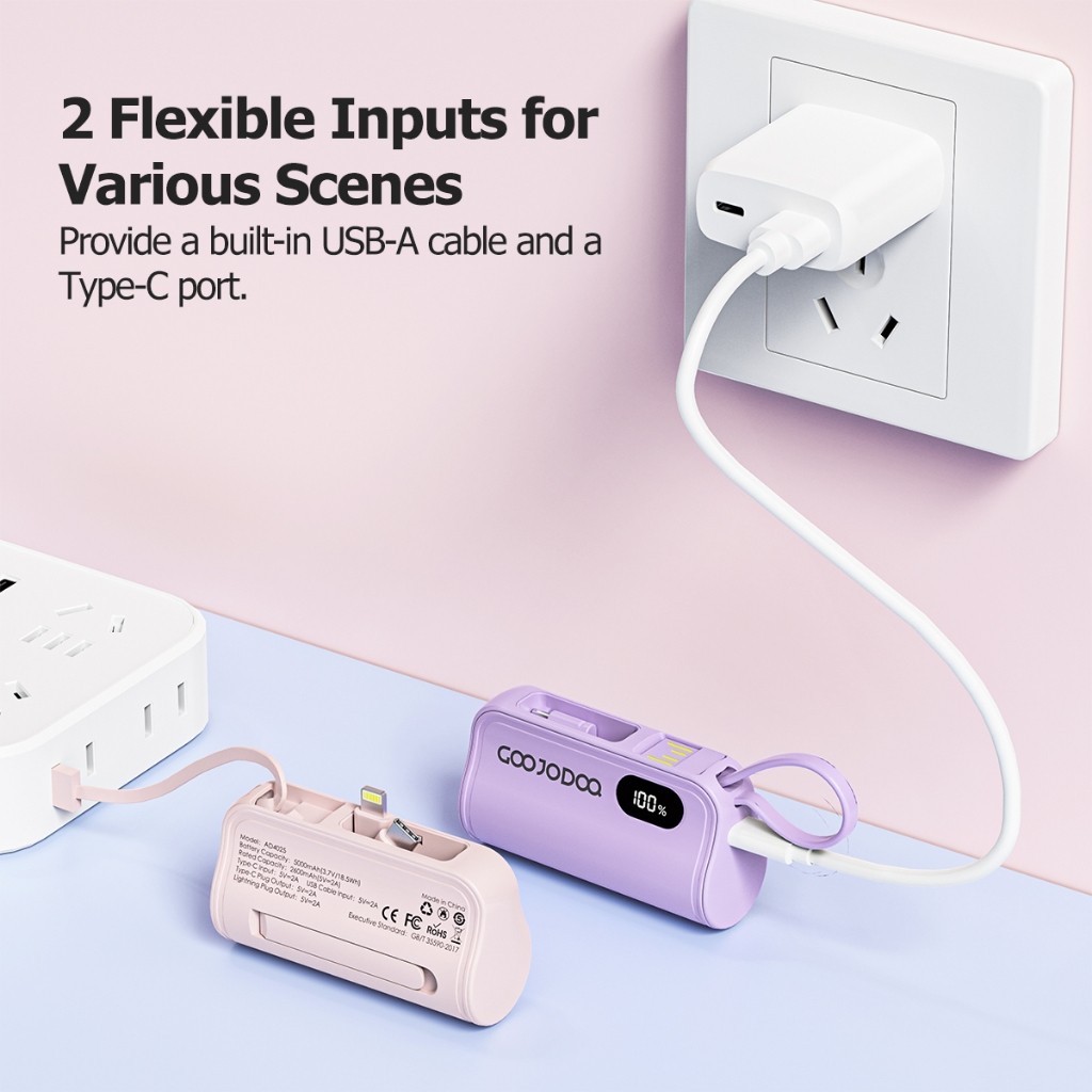 GOOJODOQ 5000mah Mini Powerbank Dengan colokan ganda Lightning + Tipe C for iphone Android Phone Built in Cable Small Po