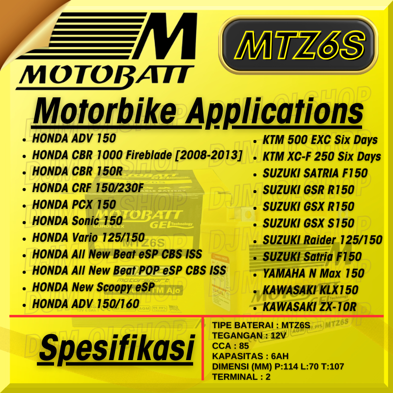 Aki Gel MOTOBATT MTZ6S Motor Vario 125/150 Pcx Sonic Cbr Nmax Aerox New Beat Aki kering Gs Astra Motobatt Original Sni