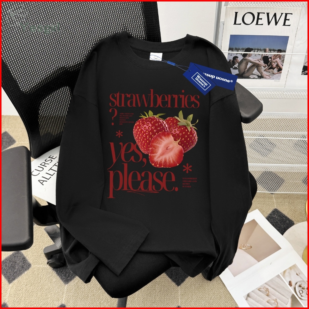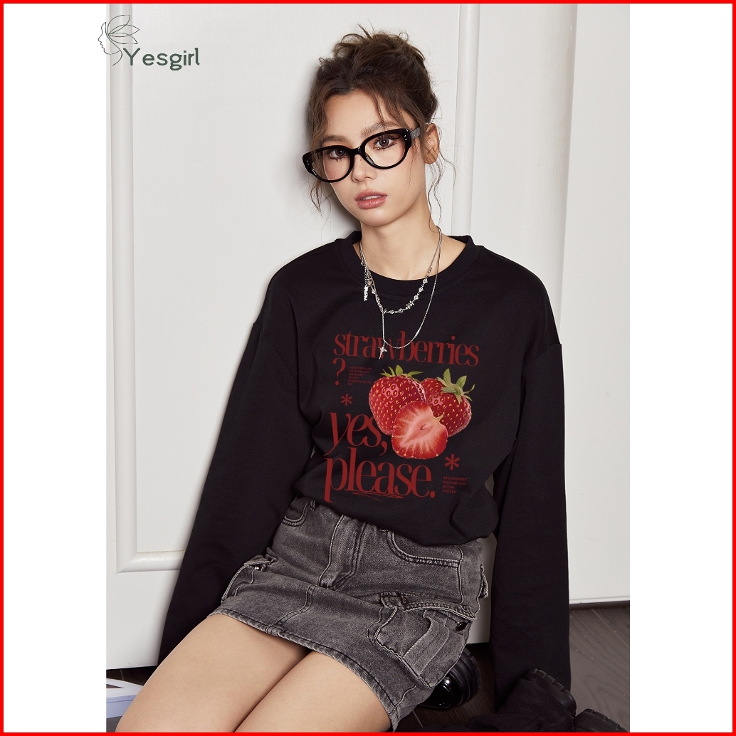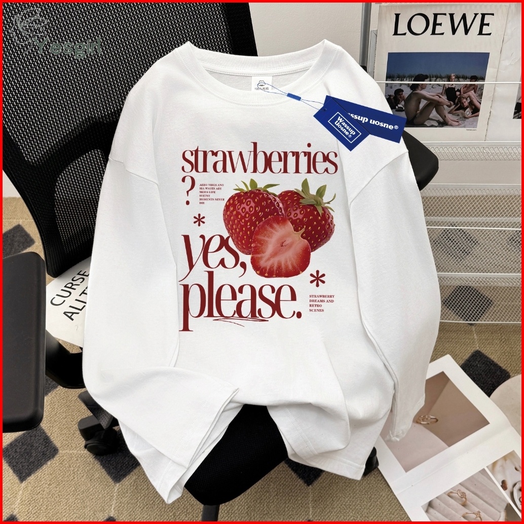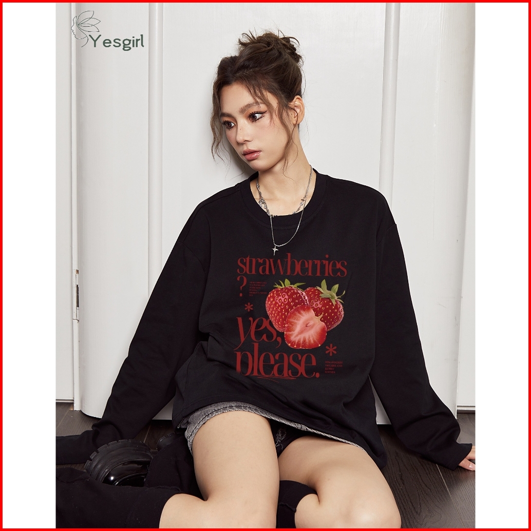 Yesgirl Korea Style Please Eat Strawberries Print Kaos Kasual Longgar Lengan Panjang Oversize Wanita Busana Gaya Korea L