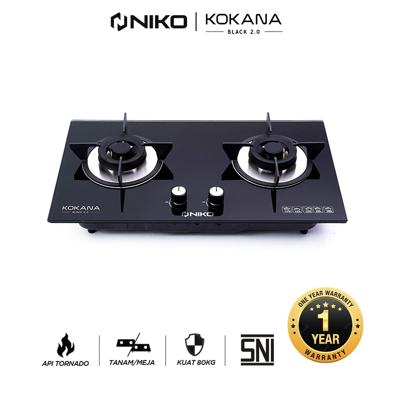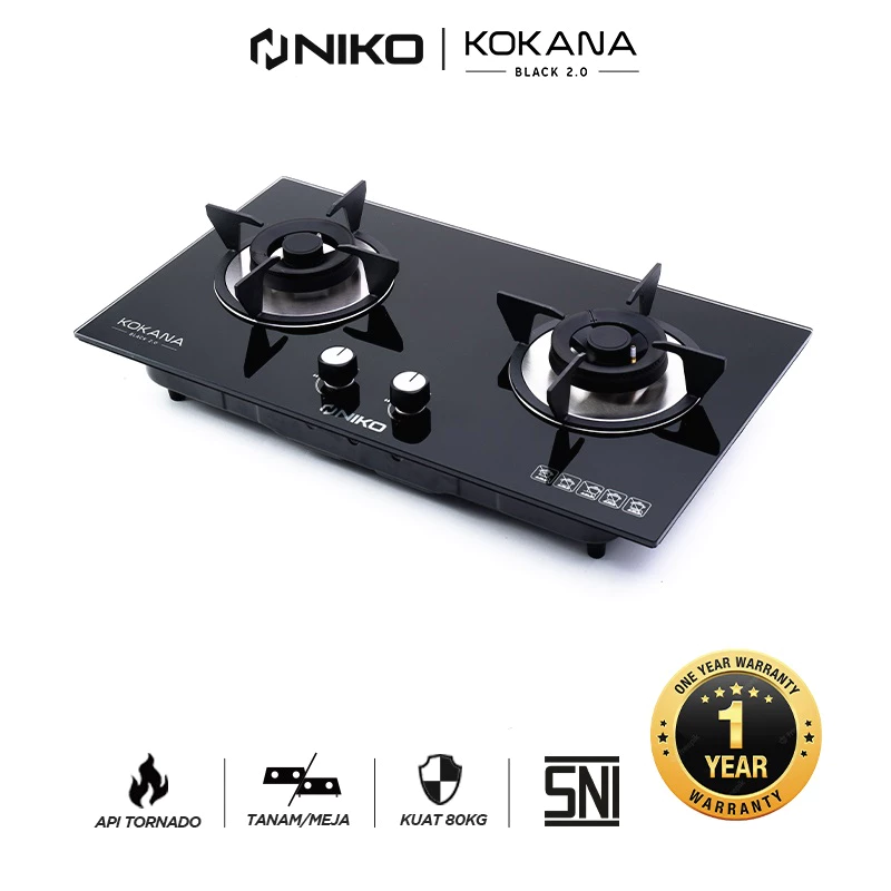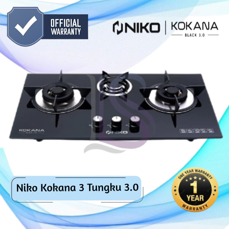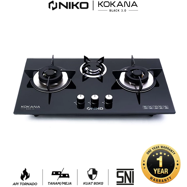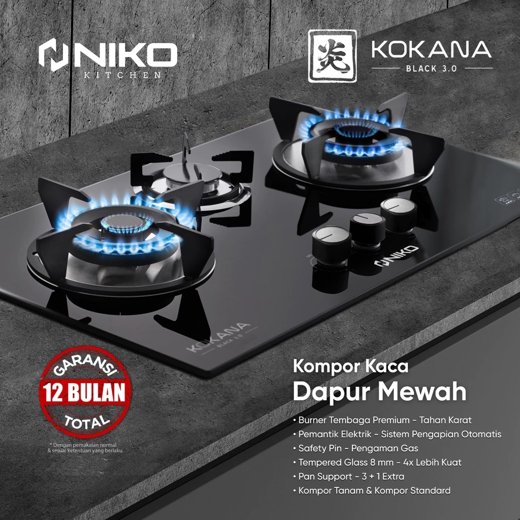 NIKO KOKANA Kompor Gas Tanam 3 Tungku Kaca Tempered Glass Api Biru