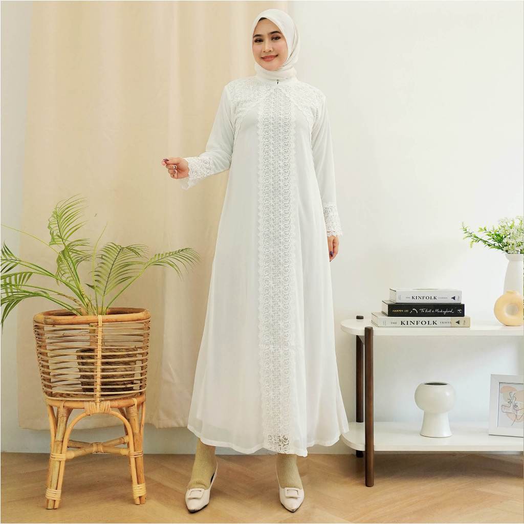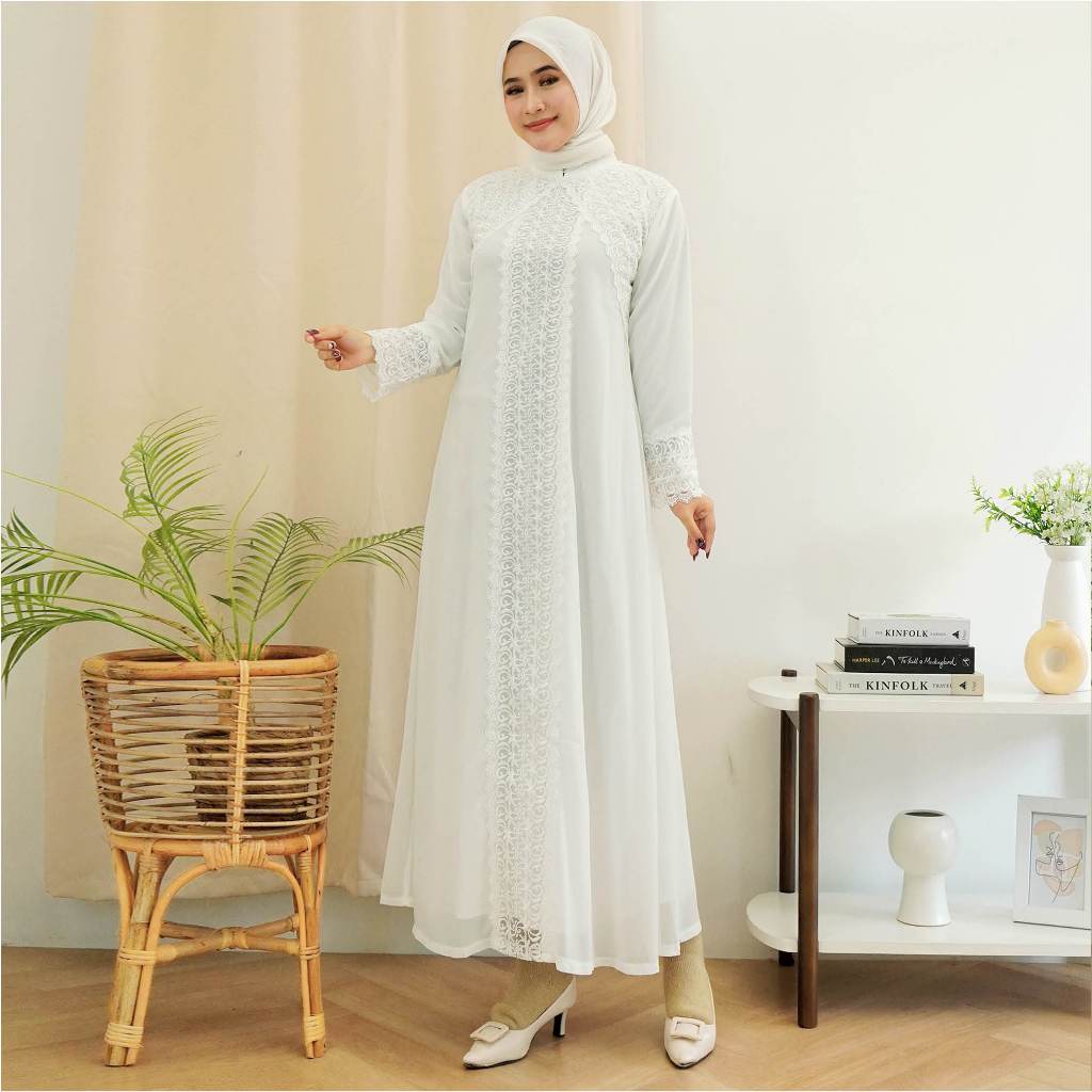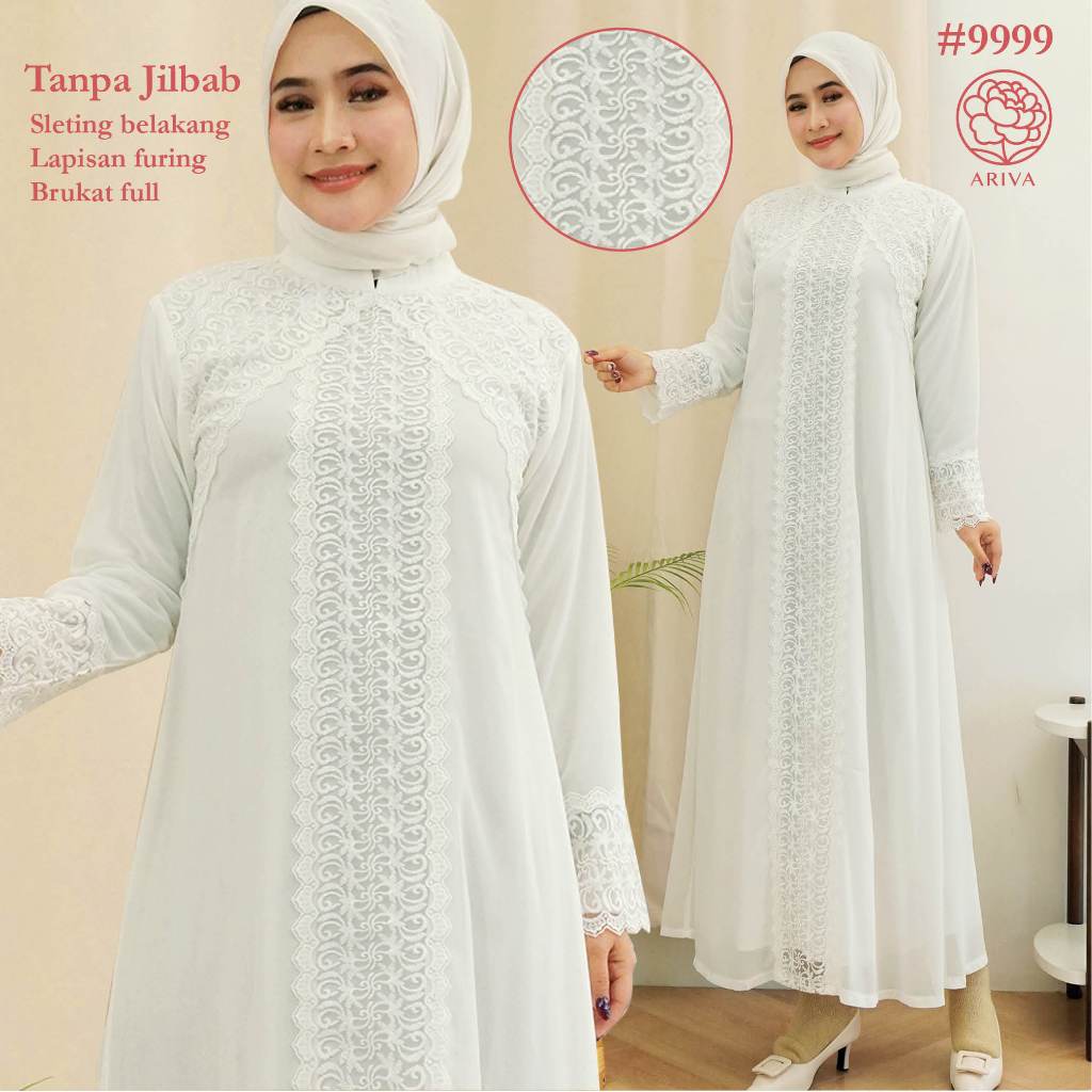 Gamis RALINE 9999 Brukat Putih Muslim - Gamis Wanita Premium Lace – Gamis Lebaran / Umroh by ARIVA