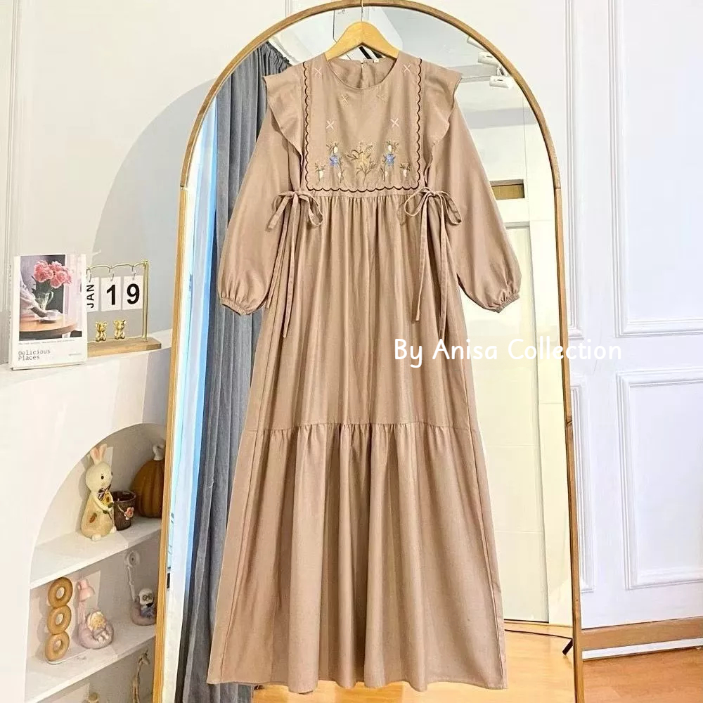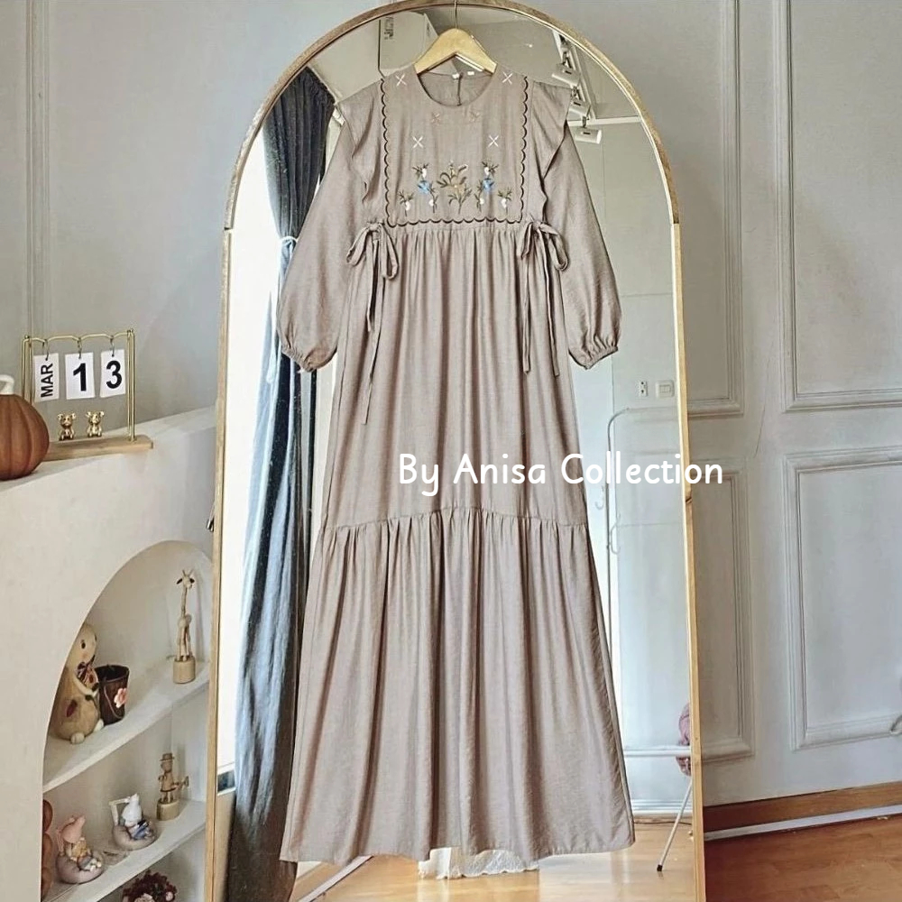 Cherika Dress - Gamis Bordir - Size S M L XL XXL 3L 5L - Gamis Jumbo Bahan Polo Linen