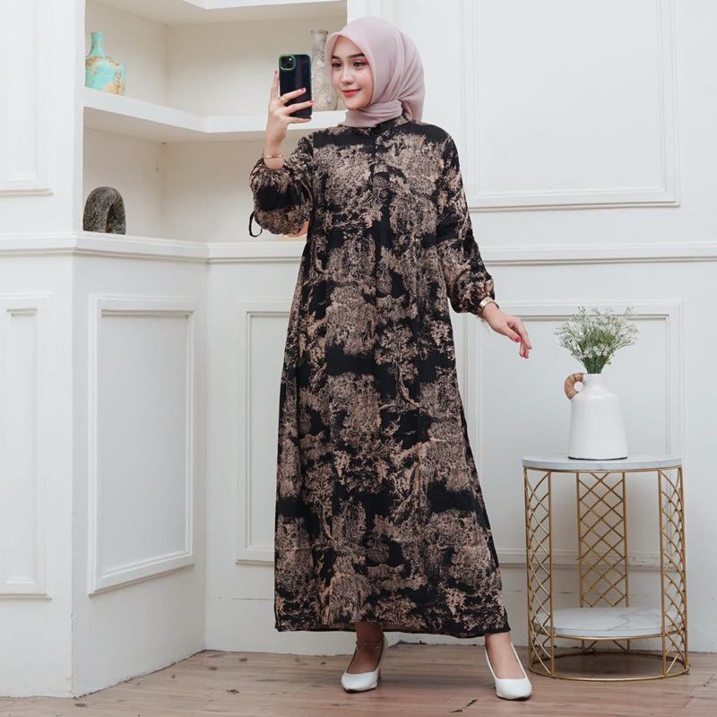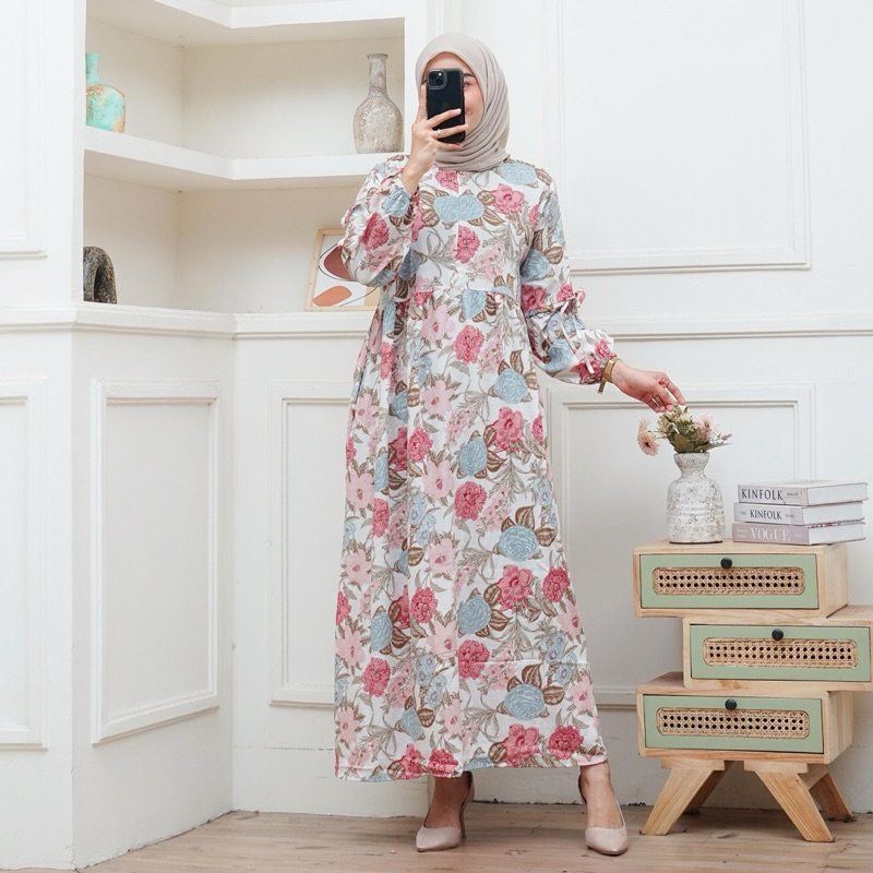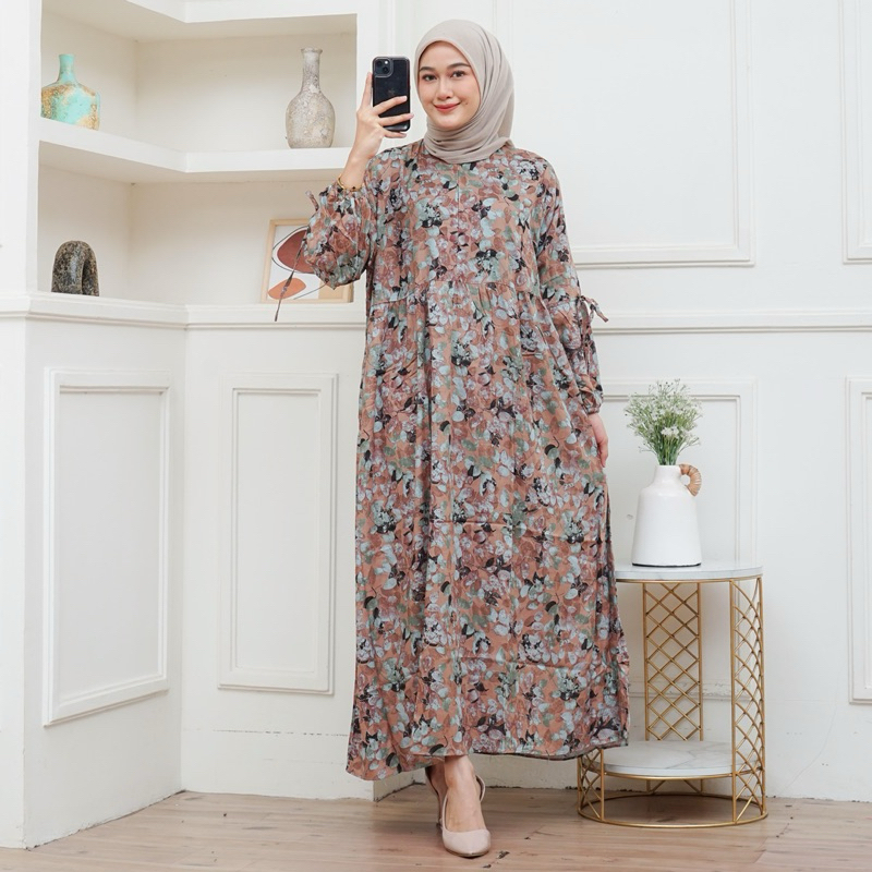 Dress Pita Lengan Balon Bahan Rayon, gamis muslim wanita panjang 130 cm cantik lembut nyaman