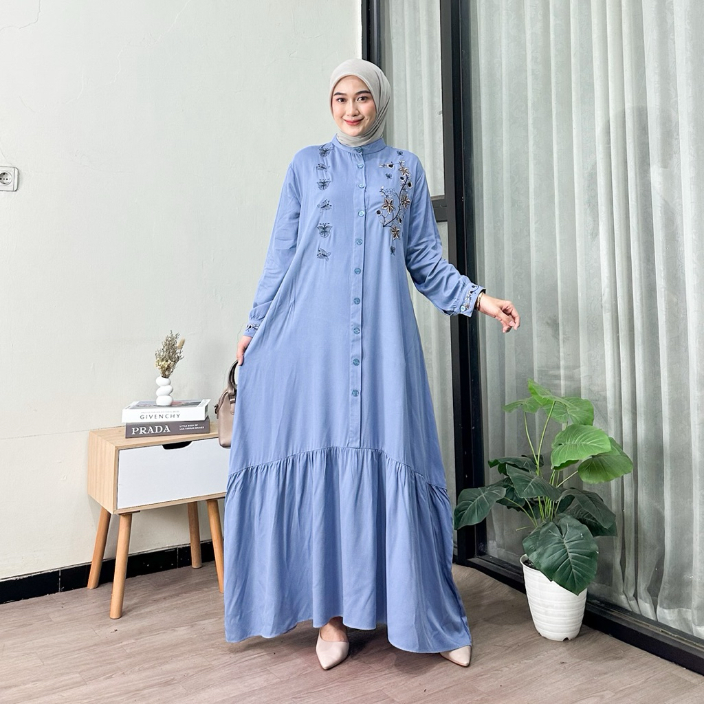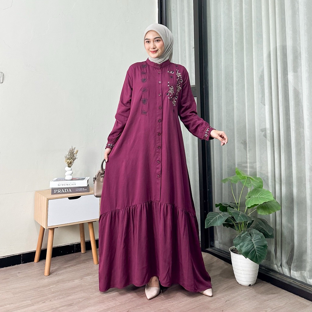 Moza Maxi Dress Muslim Wanita Bordir Gamis Rayon Premium Busui Full Kancing