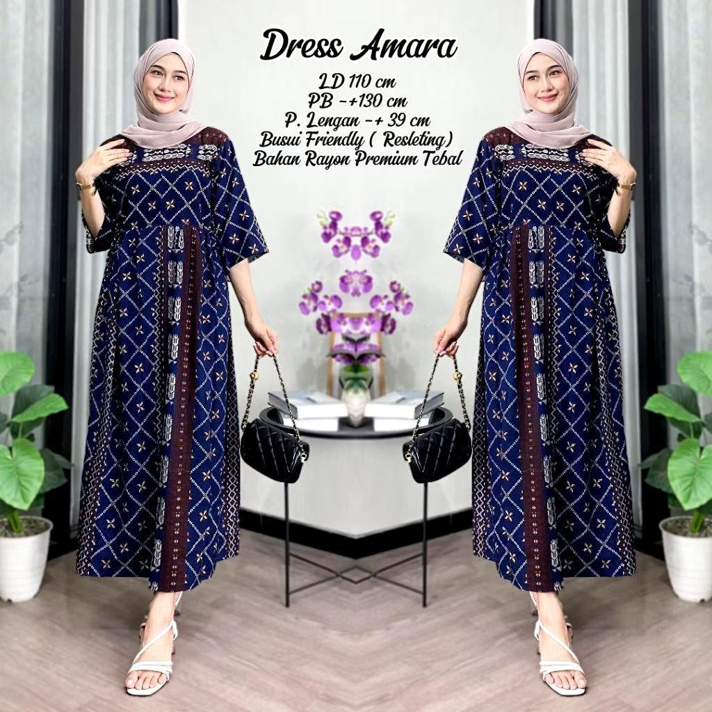 Gamis Lengan Panjang 3/4 Dress Rayon Motif Amara Jumbo Busui Friendly