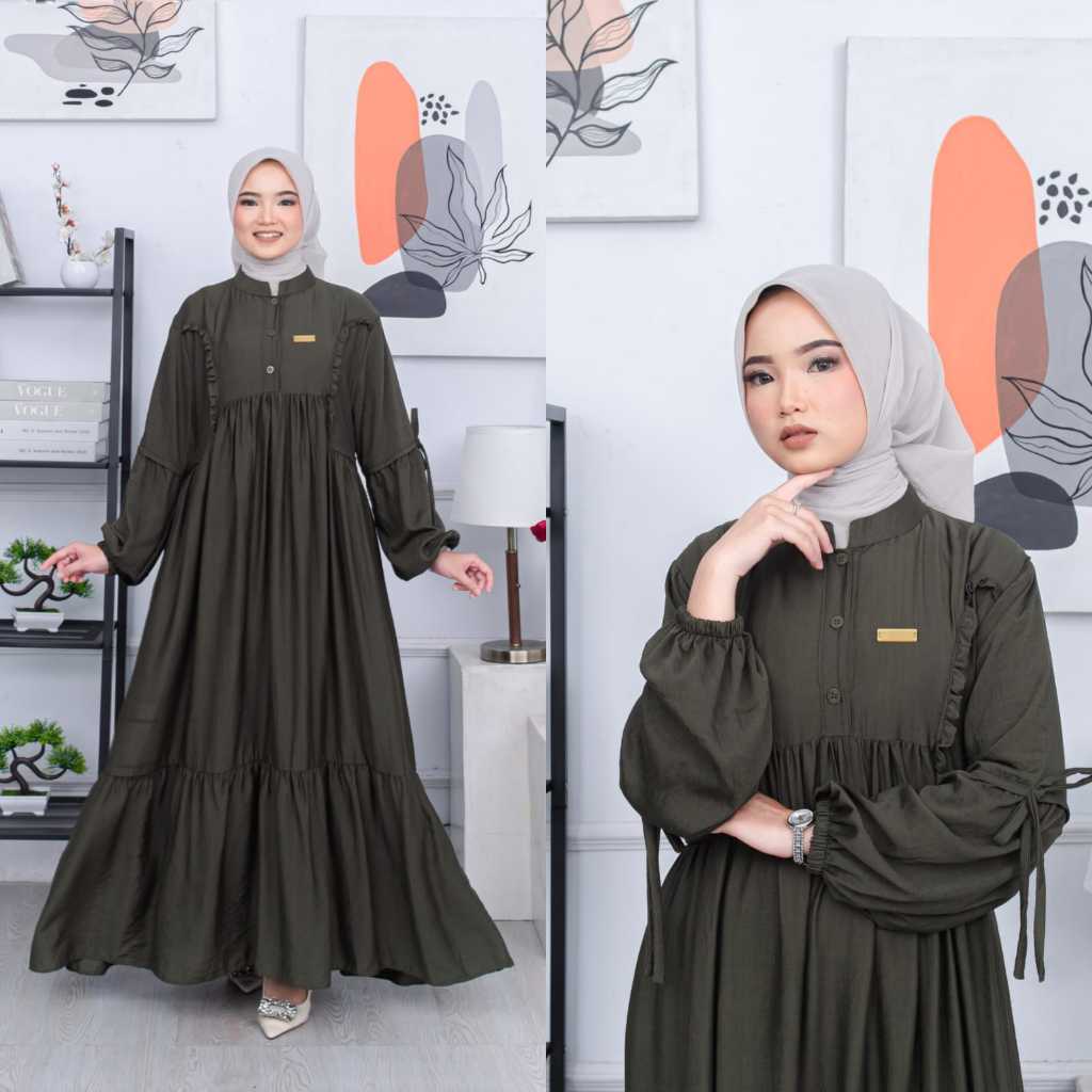 ZAFIRA DRESS Gamis Muslimah Polos Polo Linen Aksen Kancing Variasi Ruffle Cantik Busui Friendly