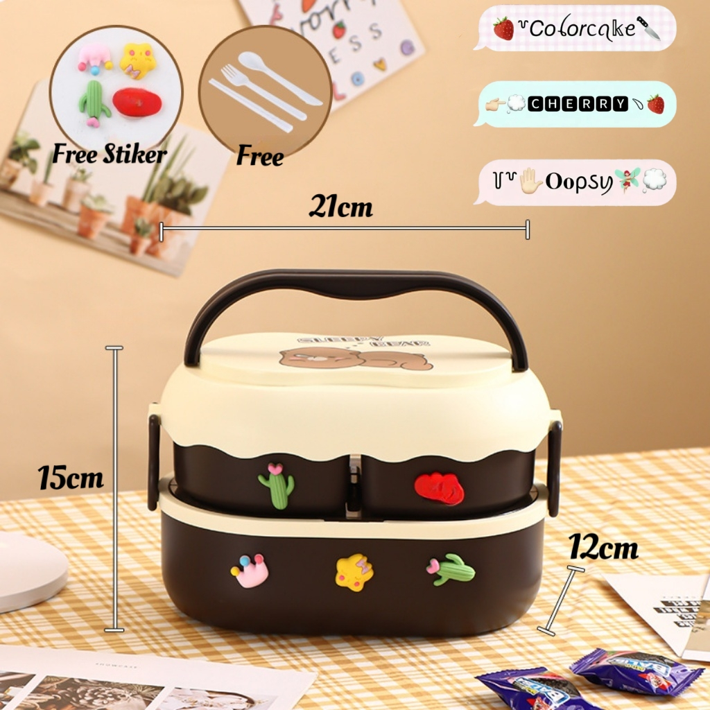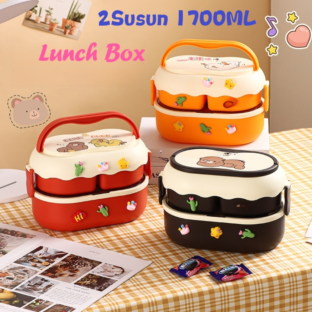Kotak Bekal Anak Sekolah 2Susun 1700ML Kapasitas Besar/Lunch Box Lucu Animal 2Susun Free Stiker 3D