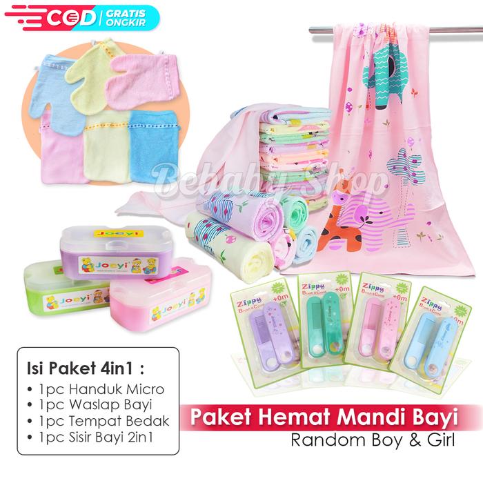 PAKET HEMAT 4IN1 PERLENGKAPAN MANDI BAYI SISIR SIKAT TEMPAT BEDAK HANDUK & WASLAP BAYI - RANDOM MOTIF