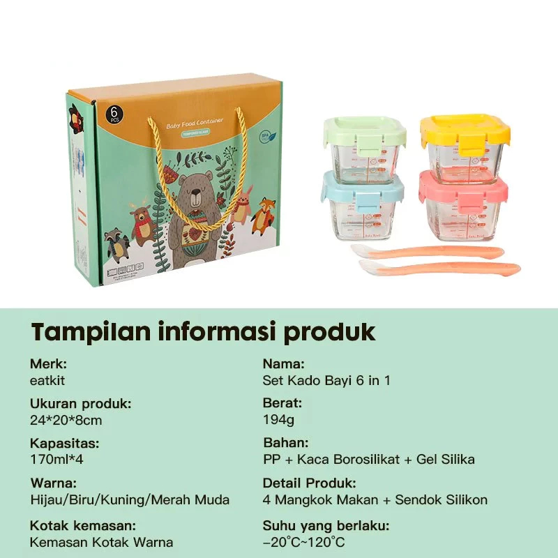 Dr.Spock 6Pcs/Set Tempat Mpasi Kaca Hampers Baby Gift Set Wadah Mpasi Kaca Kado Lahiran Bayi + Sendok Mpasi Silicon Bayi