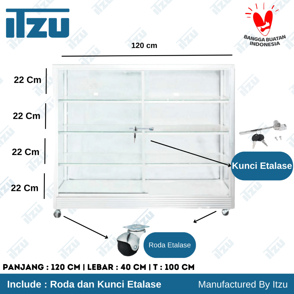 Etalase Kaca Alumunium 120 Cm / Etalase Kaca Jualan 120 cm dengan Roda dan Kunci
