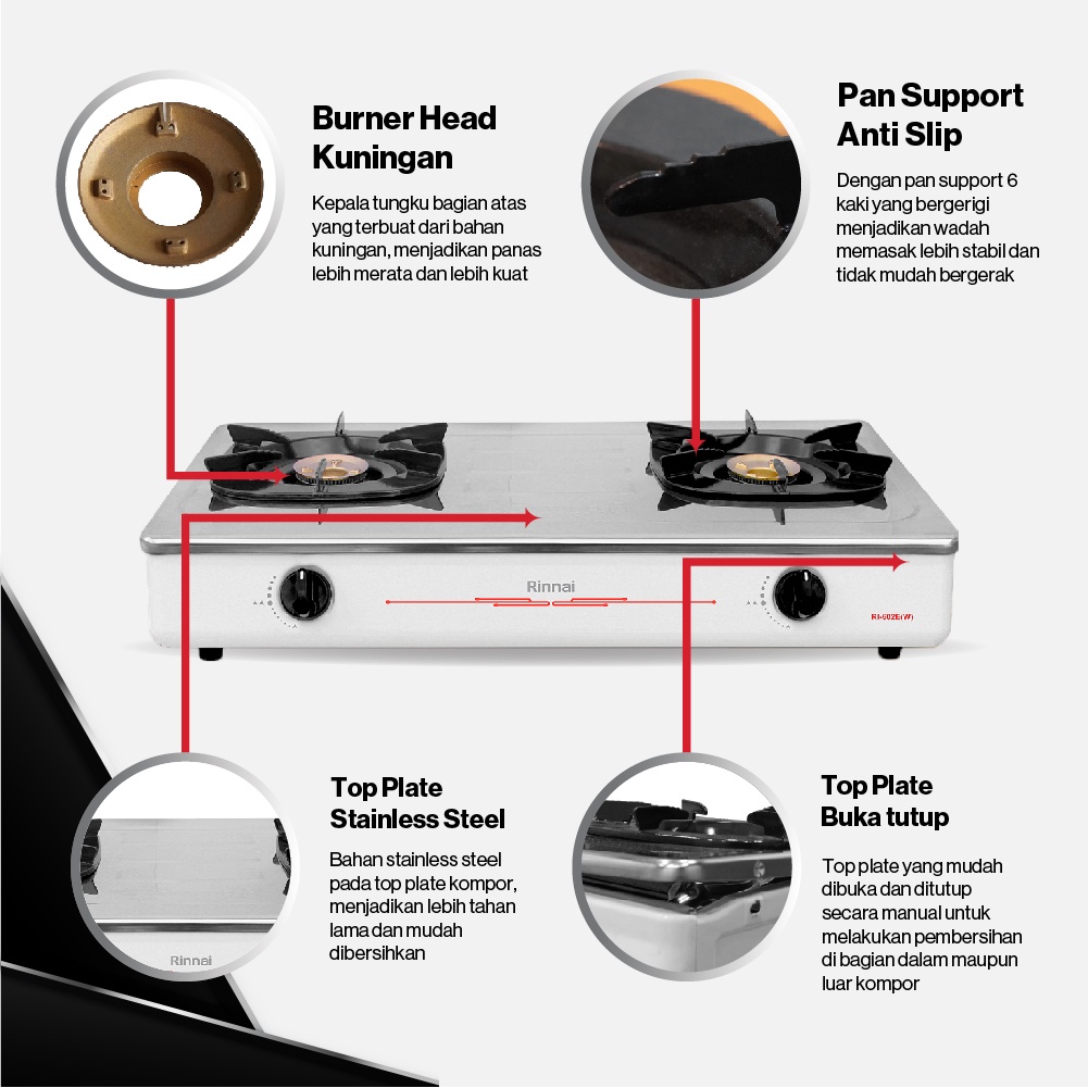 RINNAI KOMPOR GAS 2 TUNGKU RI 602E W PUTIH STAINLESS STEEL/RI602EW/RI 602EW/RI602EW/100 PERSENORIGINAL